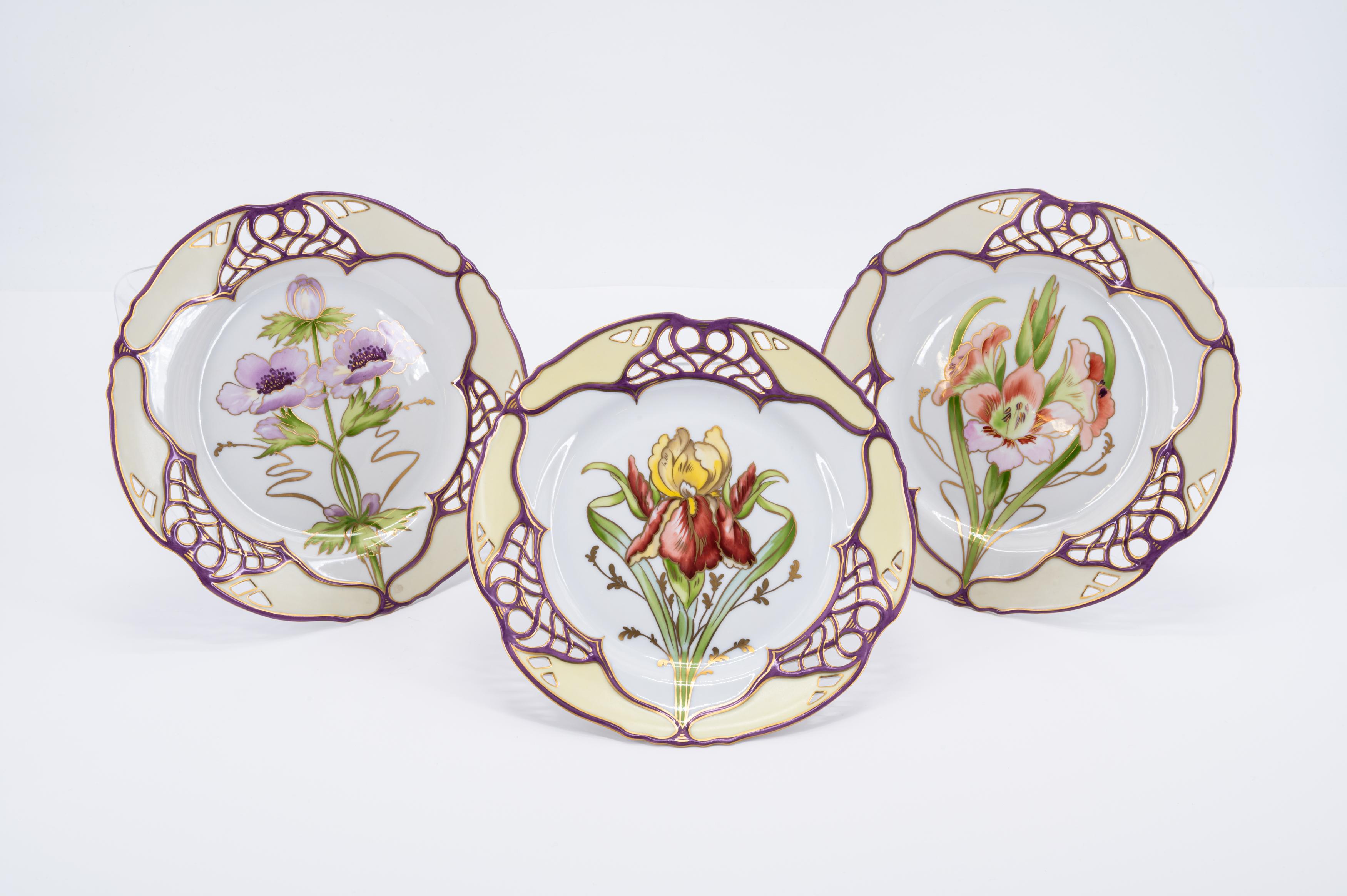 ACHT JUGENDSTIL TELLER MIT GOLDKONTURIERTEN BLUMEN.