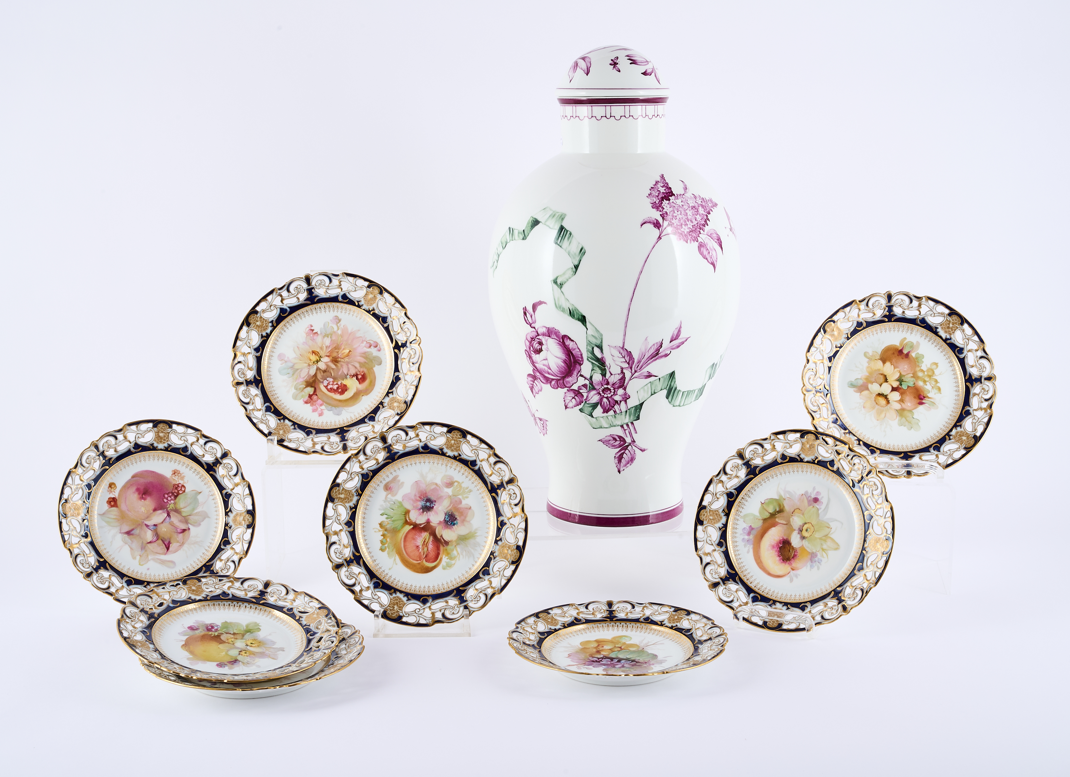 Titel: Acht Teller mit Weichmalerei und eine balusterförmige Deckelvase.