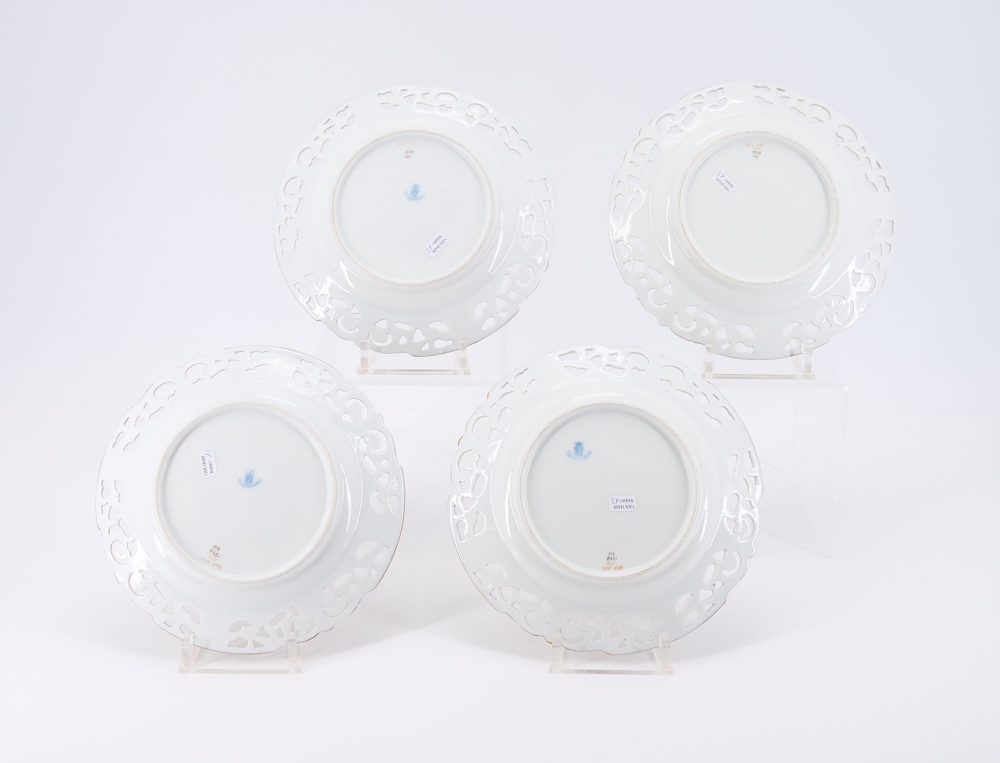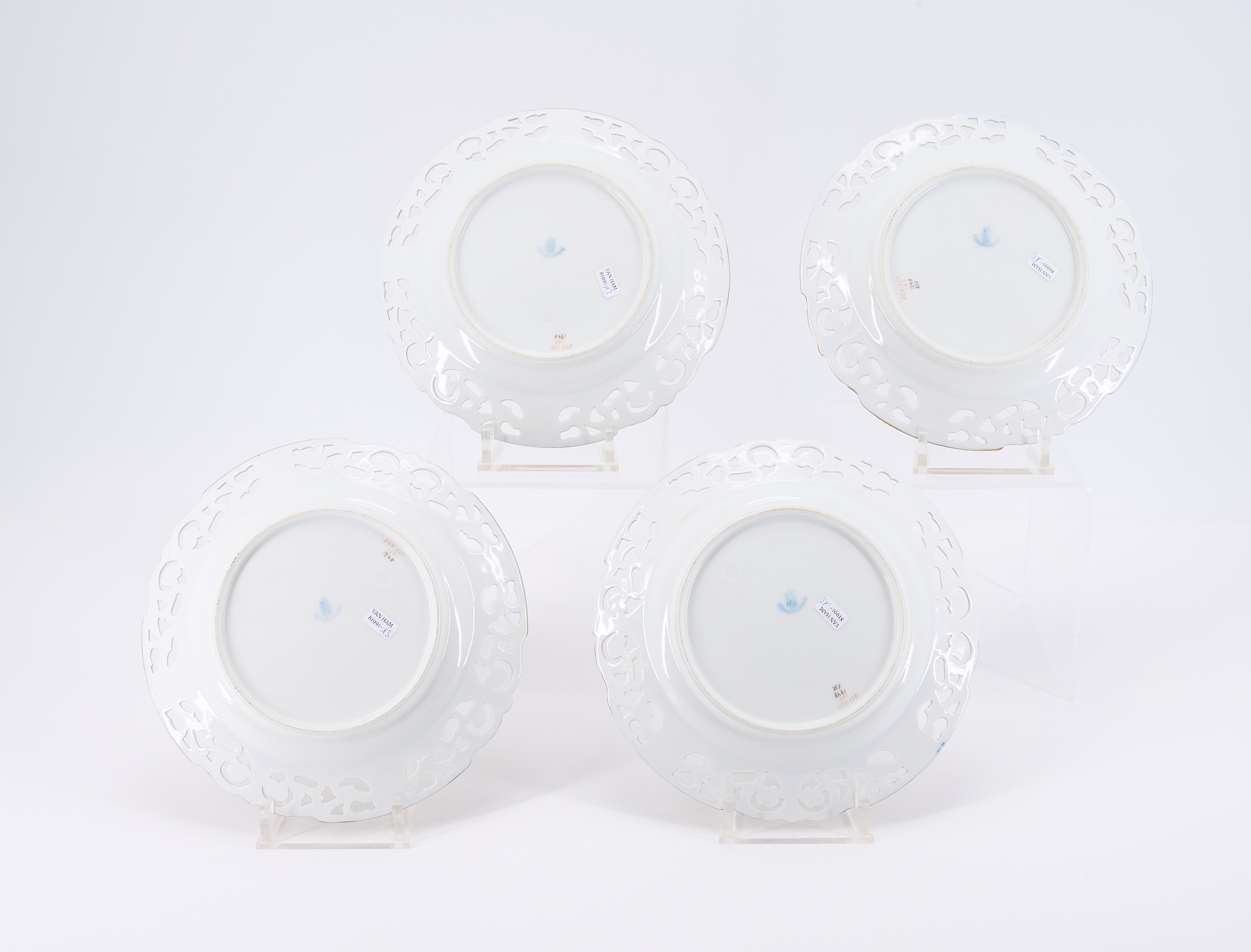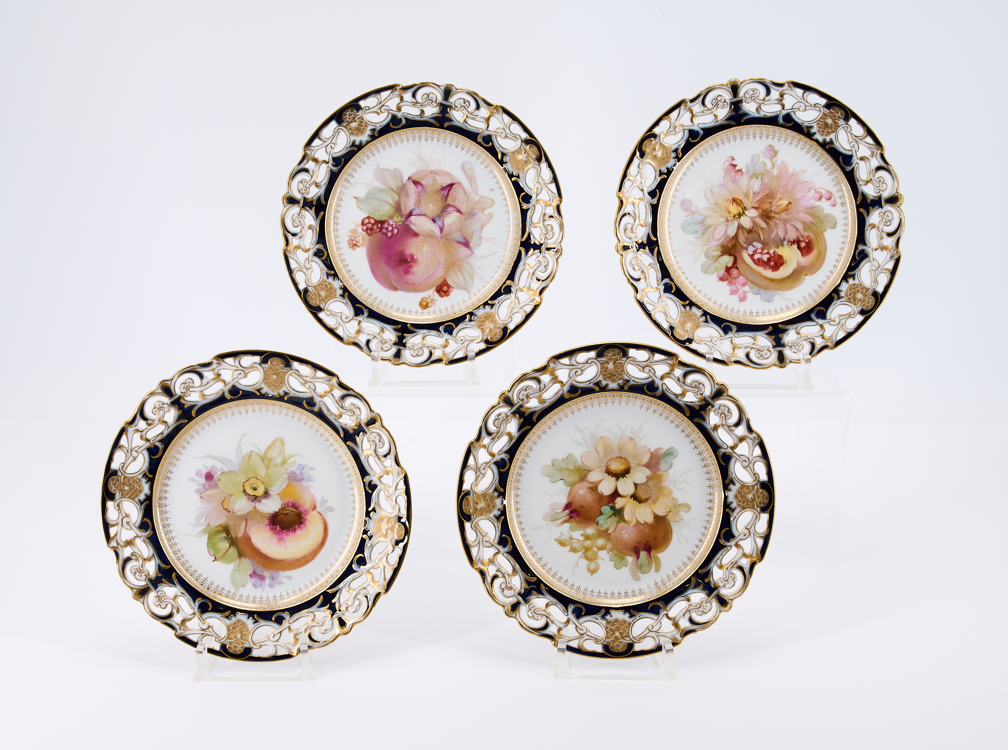 Material: Porzellan, teilweise kobaltblauer Fond, durchbrochen gearbeitet, polychrom und gold staffiert .