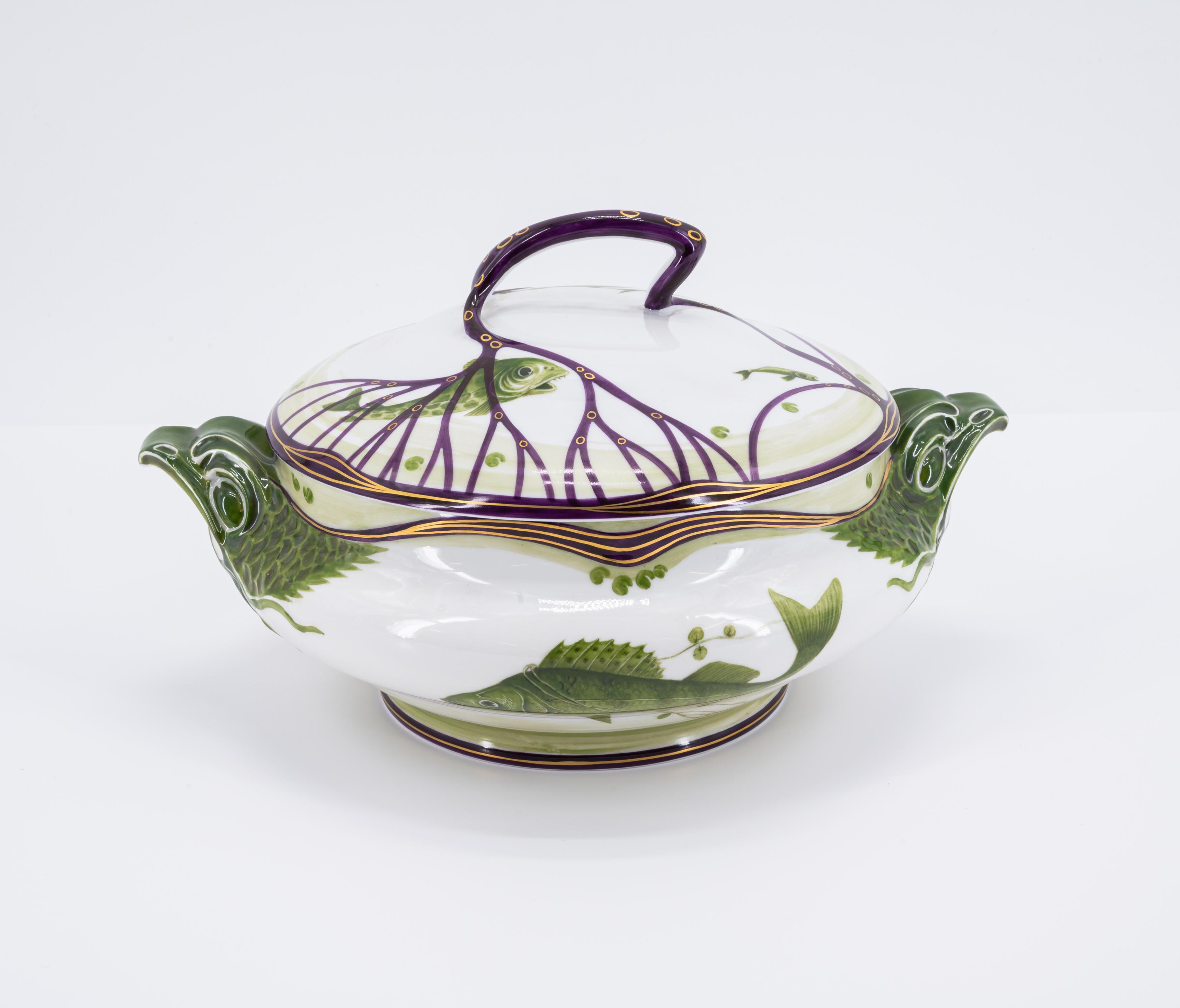 Dynamisch geschwungene Jugendstilformen. Grüner und violett-brauner Dekor mit goldenen Akzenten. Alle Teile mit Fischen und anderen kleinen Wasserbewohnern wie Schnecken oder Kaulquappen dekoriert. Teilweise stilisierte Wasserpflanzen.