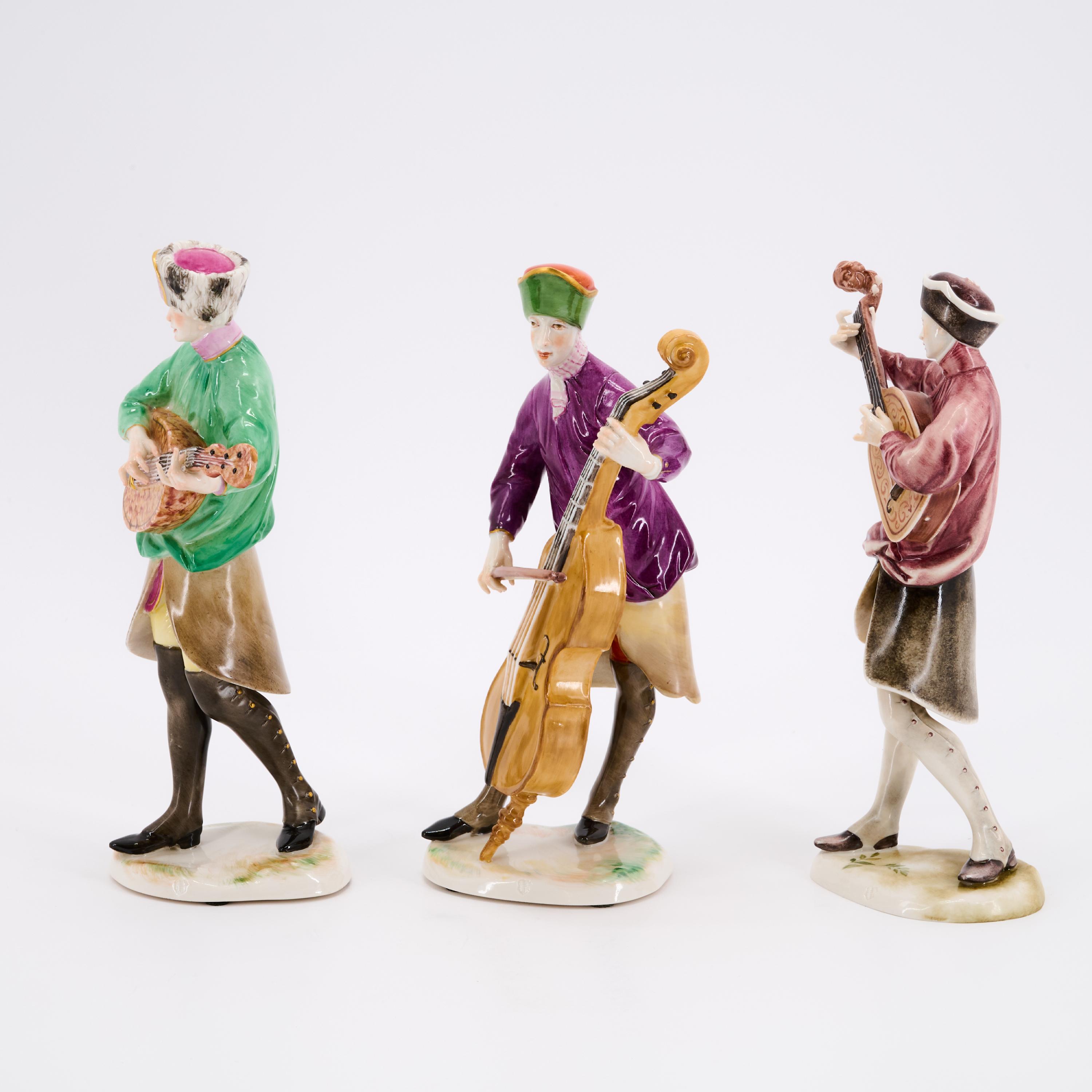 Beschreibung: Ein Violinenspieler, ein Kontrabassspieler, ein Flötenspieler, ein Mandolinenspieler und
