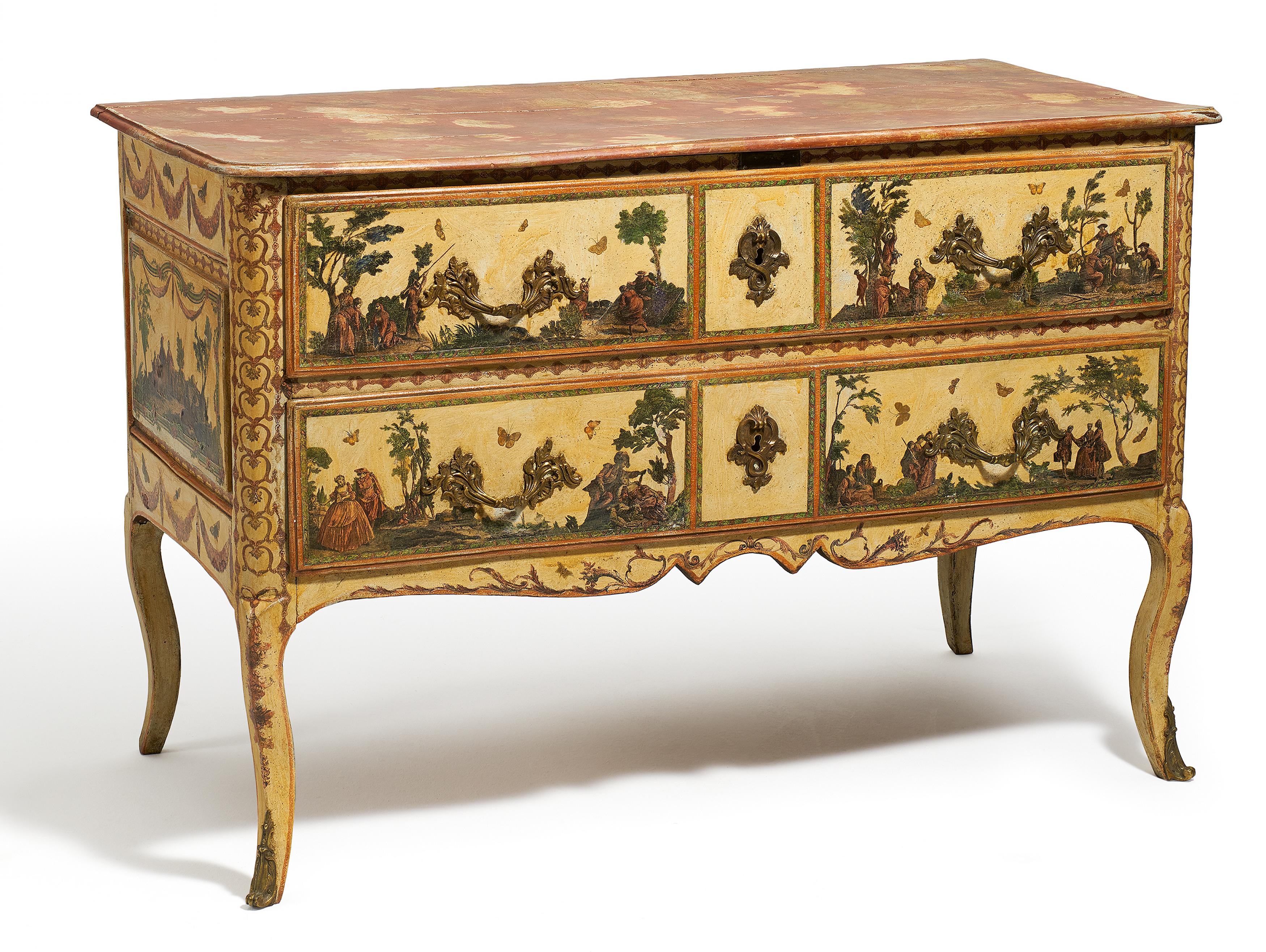 Durch das Aufbringen meist handkolorierter Kupferstiche, welche wiederum mit einem speziellen, gelblichen Lack, dem sog. "sandracca" (oder Sandarak) überzogen wurden, versuchte man eine Art Imitation der beliebten chinesischen und japanischen Möbel. Spezielle Ausschneidebögen und Vorlagenstiche ließen in der Gestaltung keine Wünsche offen. Wie auch auf der hier aus dem 18.Jh. stammenden Kommode wurden meist figürliche oder galante Szenen und Landschaften auf den hellen Untergrund aufgetragen.