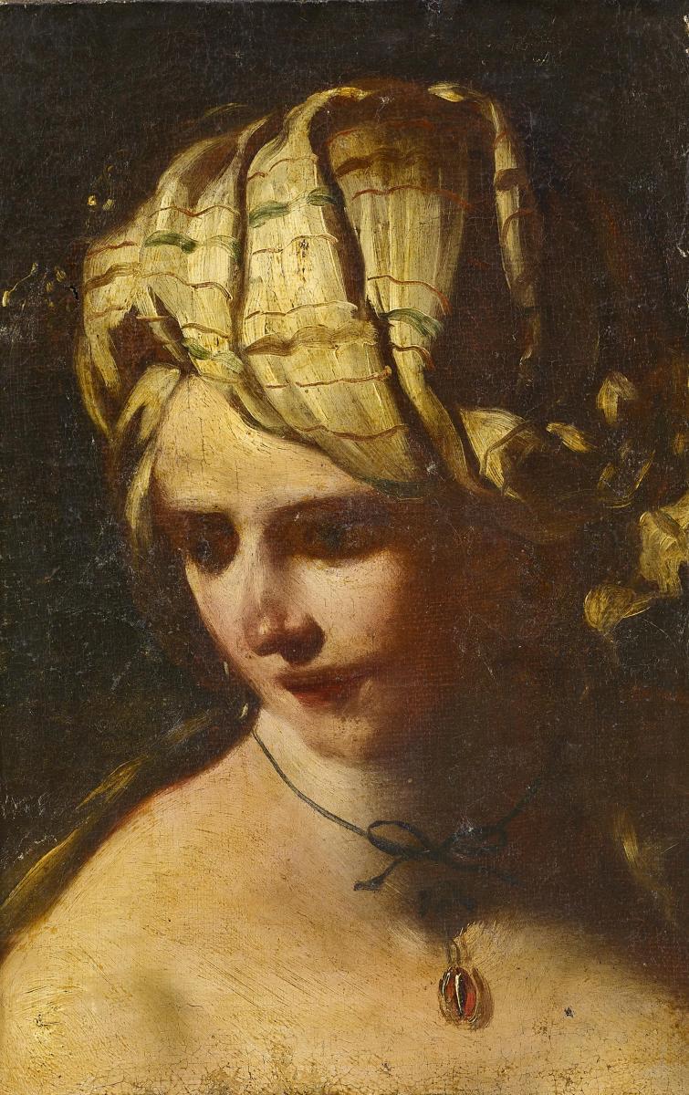 Brustbild einer jungen Frau. Studie zu einer Sibyllenfigur. Öl auf Leinwand. Doubliert. 43 x 30cm. Rahmen.