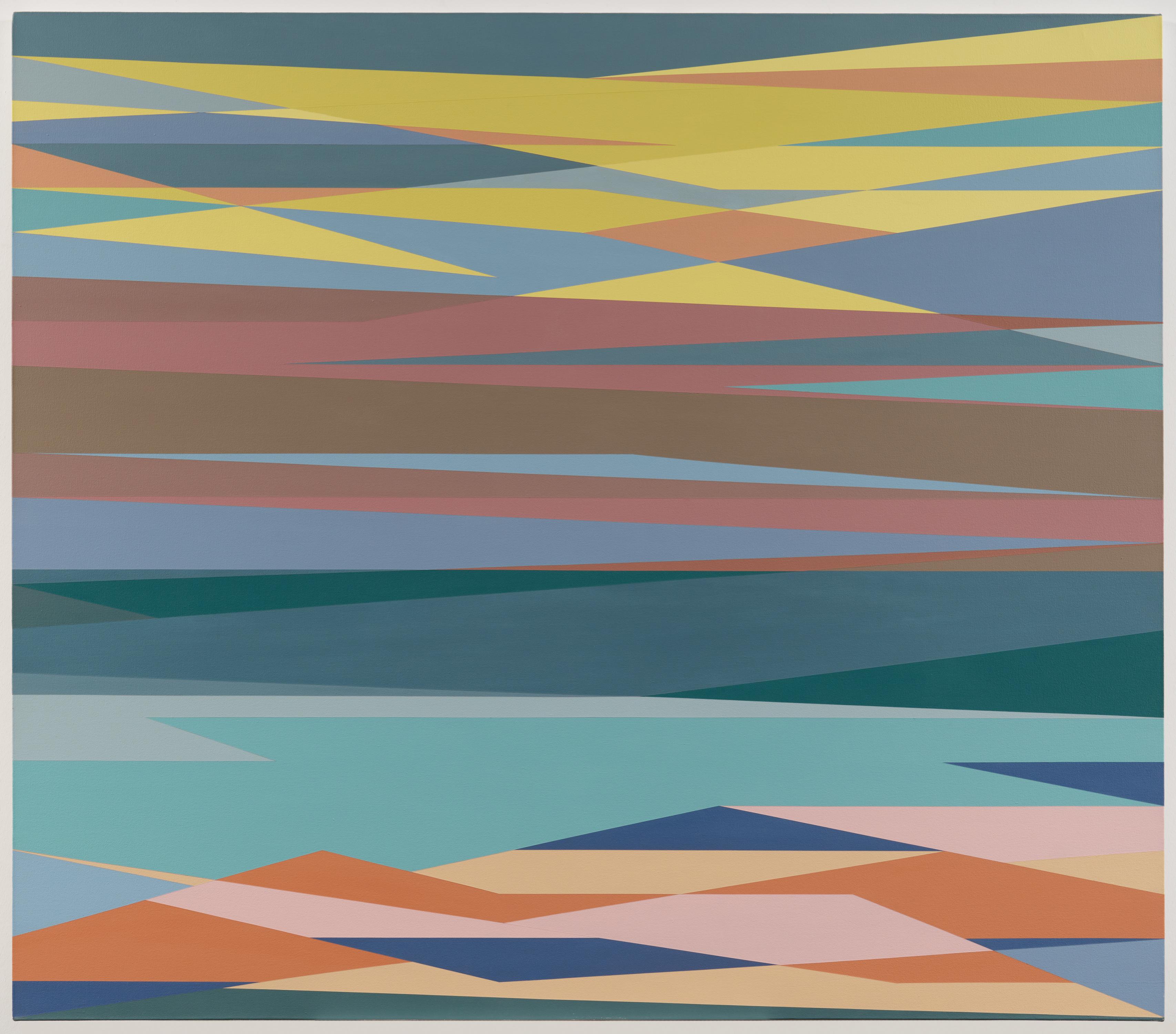 Das hier vorgestellte Gemälde besticht zunächst durch seinen komplexen Bildaufbau aus farbigen spitz- wie stumpfwinkligen Dreiecken, was in einer Kombination kristalliner Farbfelder mündet. Doch plötzlich kippt die flache abstrakte Komposition ins Räumliche, transformiert sich in eine Landschaft. Hinter einem hügeligen Vordergrund mutet eine blaue Fläche wie ein Gewässer an, das an eine Ebene grenzt, die sich bis zum Horizont erstreckt - alles wird überstrahlt vom sonnendurchfluteten Himmel.