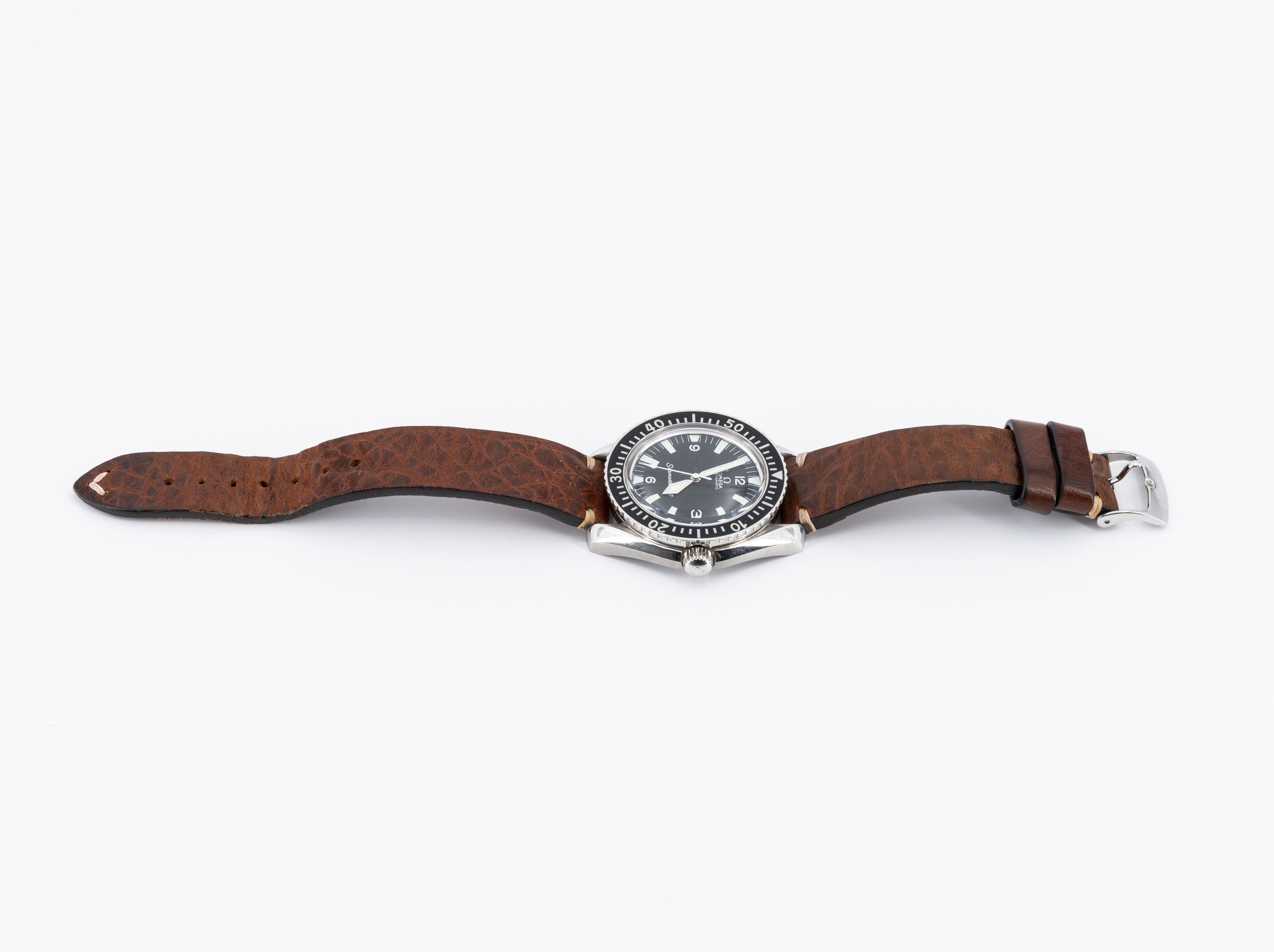 Gehäuse/Armband: Stahl, Lederarmband mit Dornschließe, Zffbl. Schwarz, Zeiger silbern, arabische Ziffern, Indizes Leuchtmasse.