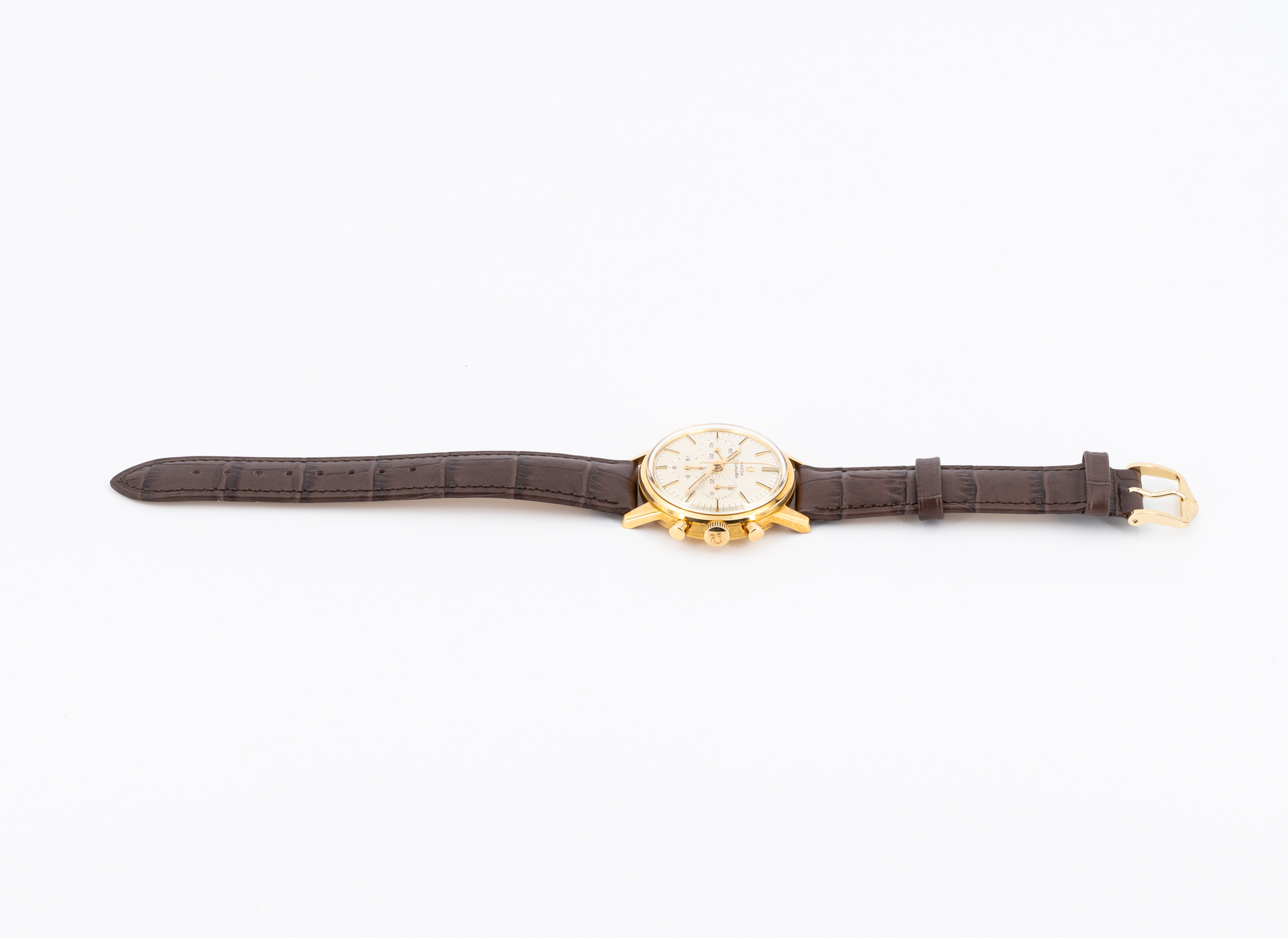 Beschreibung: 3-Zeiger-Chronograph mit 30-Minutenzähler bei "3" Uhr, 12-Stundenzähler bei "6" Uhr und dezentraler Sekunde bei "9" Uhr.