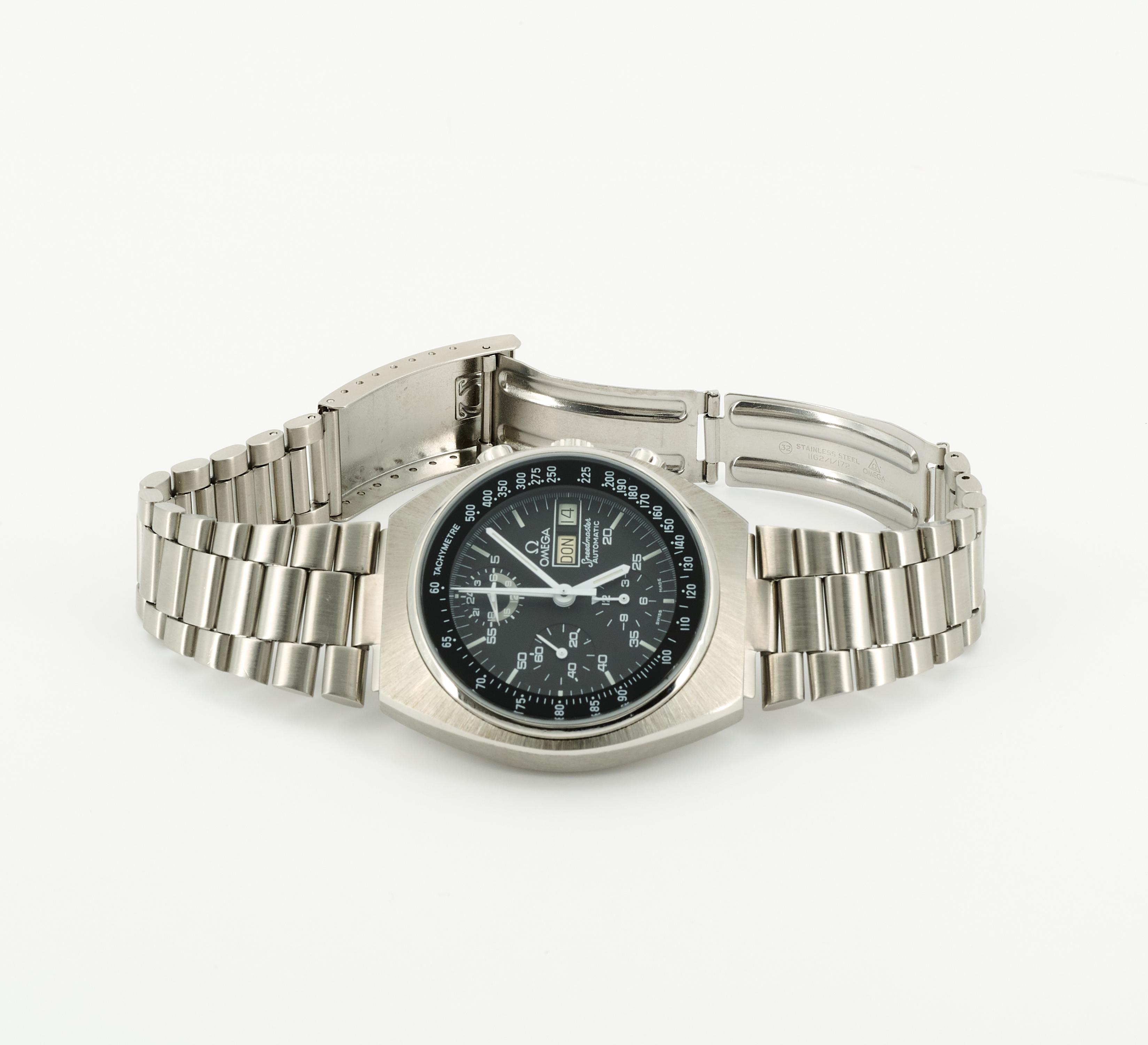 Gehäuse/Armband: Stahl, Gliederarmband mit Faltschließe, Zffbl. schwarz, Zeiger weiß, Indizes weiß, Leuchtmasse.