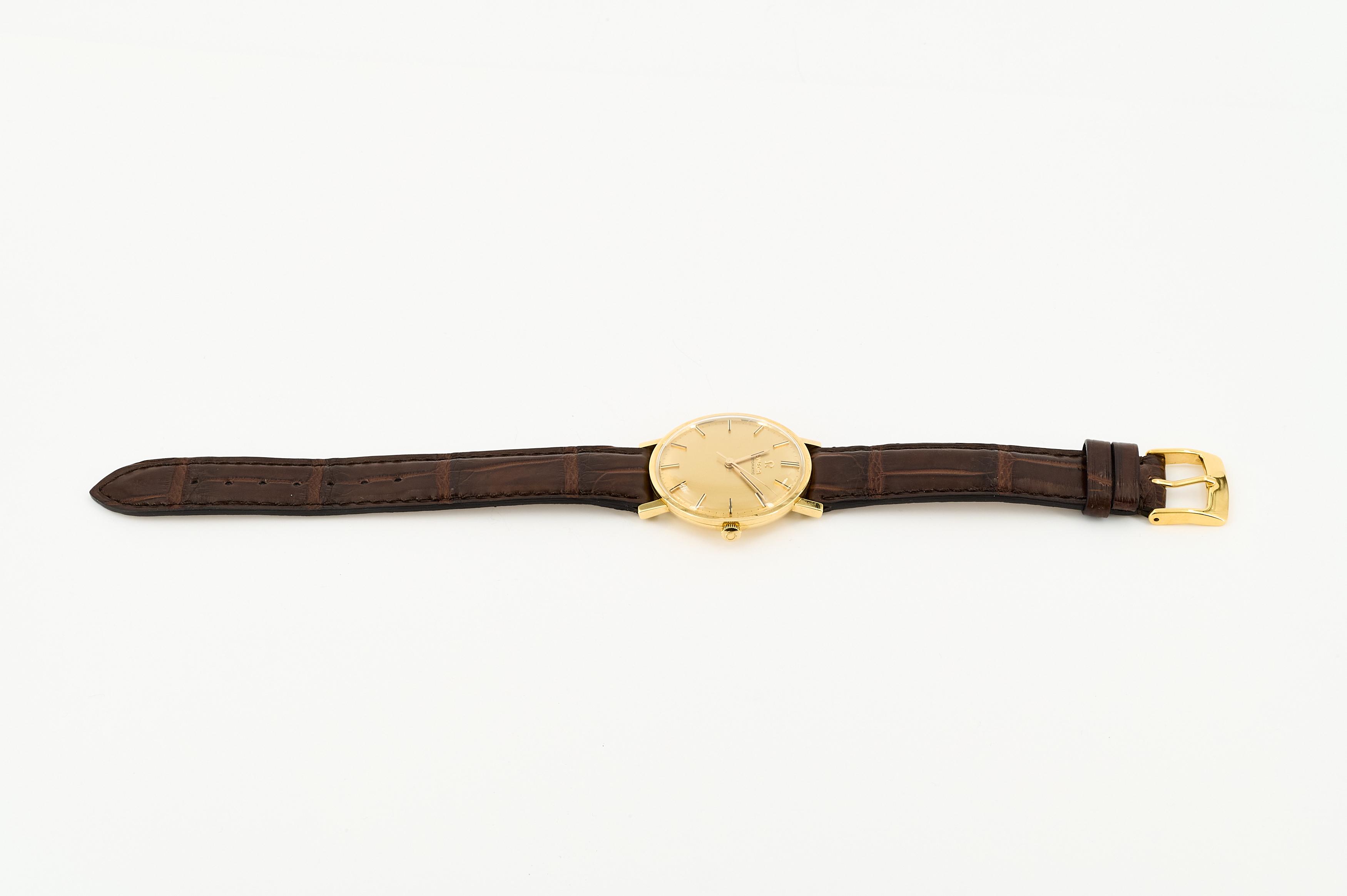 Gehäuse/Armband: 750/- Gelbgold, Lederarmband mit Dornschließe, Zffbl. golden, Zeiger und Indizes golden.
