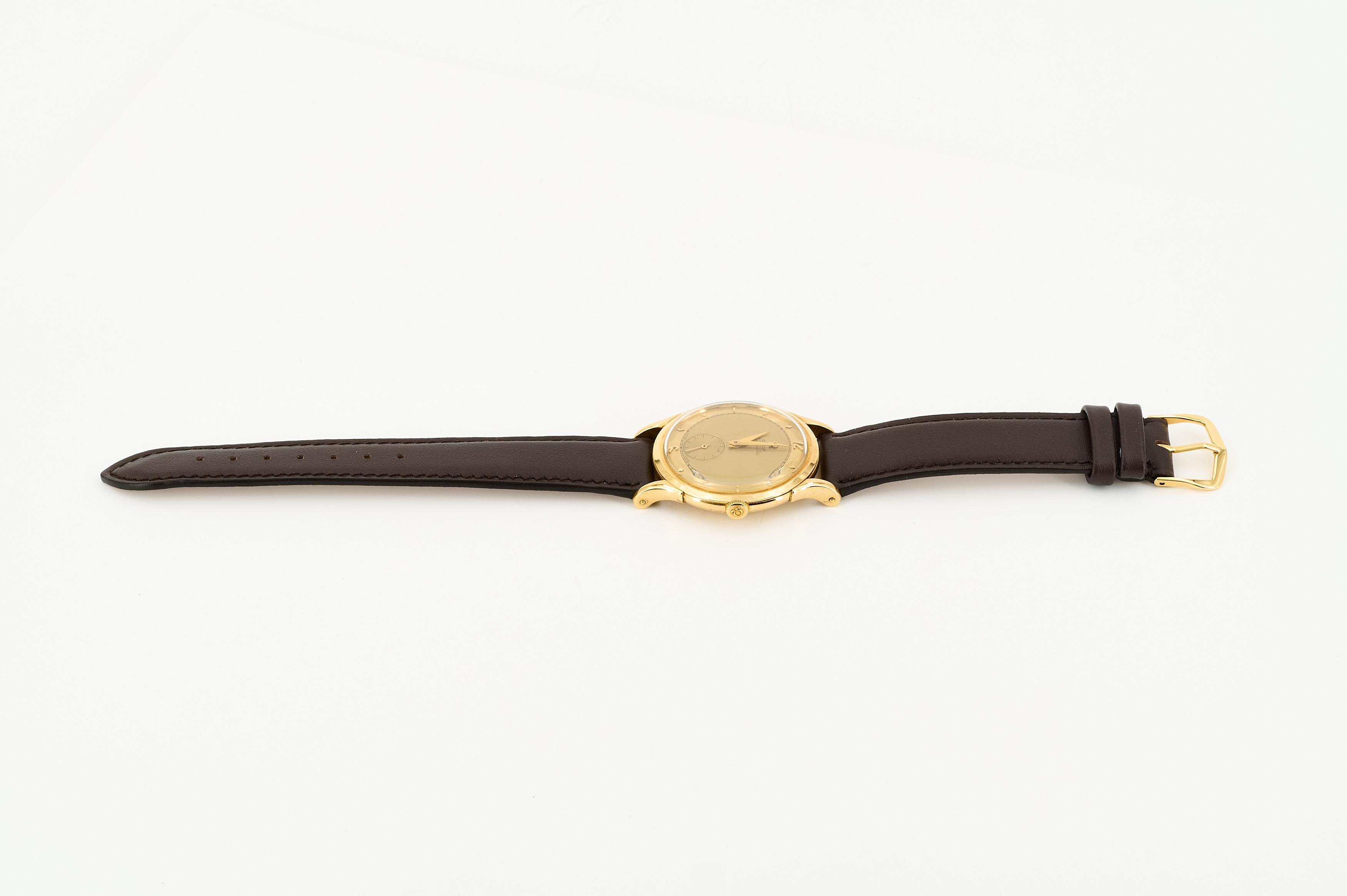 Gehäuse/Armband: 750/- Gelbgold, Lederarmband mit Dornschließe, Zffbl., Zeiger und Indizes golden.
