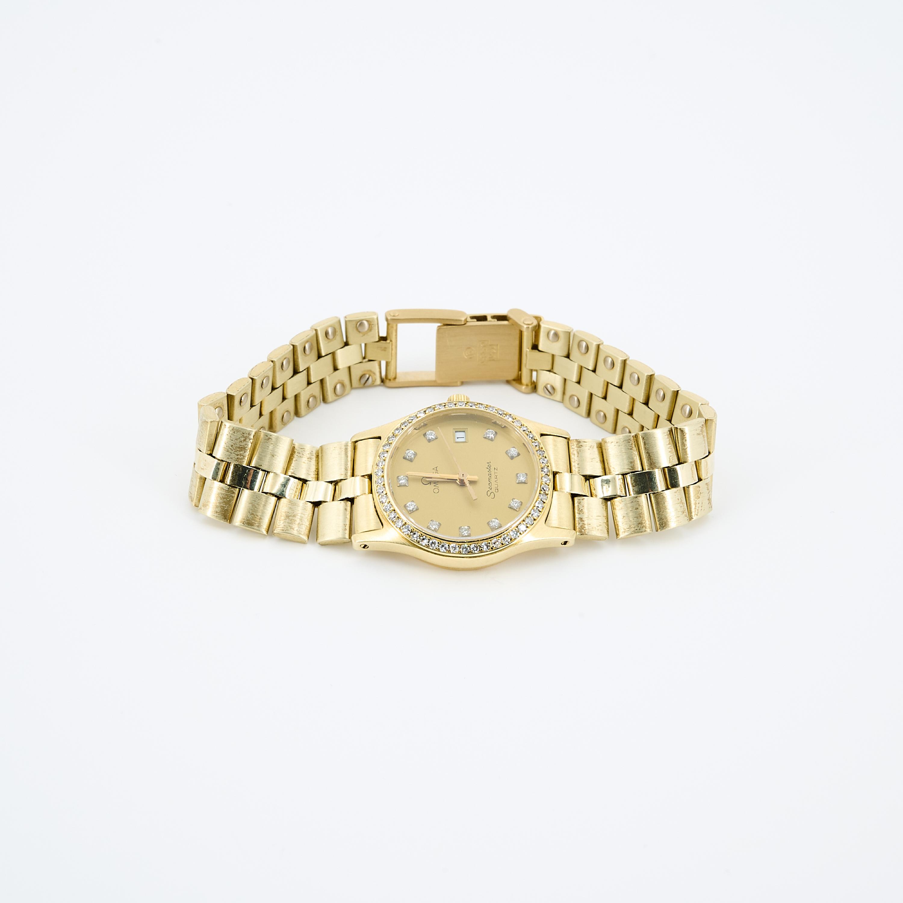 Gehäuse/Armband: 585/- Gelbgold mit Brillantbesatz, 50 Diamanten im Achtkant-Schliff zus. ca. 0,5 ct., Gliederarmband mit Kastenschloss, Zffbl. und Zeiger golden, Brillant Indizes.