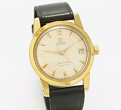 Schweiz. Automatik. 750/- Gelbgold (Punze), Lederband schwarz, Orig.-Dornschließe (Plaque), Zeiger/Indizes golden. Gewicht: 45,5g. L.ca. 22,5cm, D.ca. 3,4cm. Datumsanzeige.