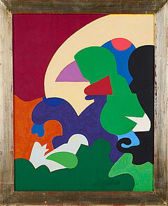 Leichte Verschmutzungen, vor allem im hellgelben Bereich oben rechts und im dunkelgrünen Bereich unten rechts. Vereinzelt kleine Bereibungen in den Randbereichen mit minimal hochstehenden Farbschollen. Ansonsten guter Zustand. Im Rahmen beschrieben.