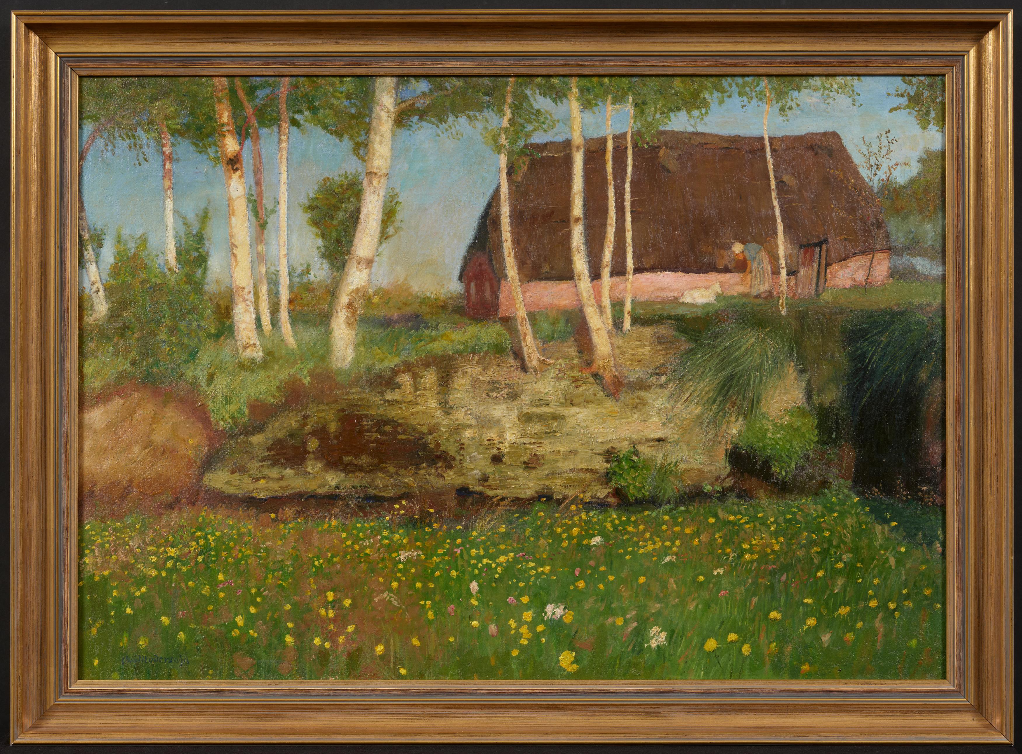 In weichem Morgenlicht erheben sich helle Birkenstämme vor einem reetgedeckten Bauernhaus. Die taufrische Wiese ist übersät mit gelben Wildblumen. Alles erscheint von Ruhe und innerer Harmonie durchdrungen - die Szene strahlt jene kontemplative Stimmung aus, die für Modersohns Kunst um die Jahrhundertwende so charakteristisch ist.