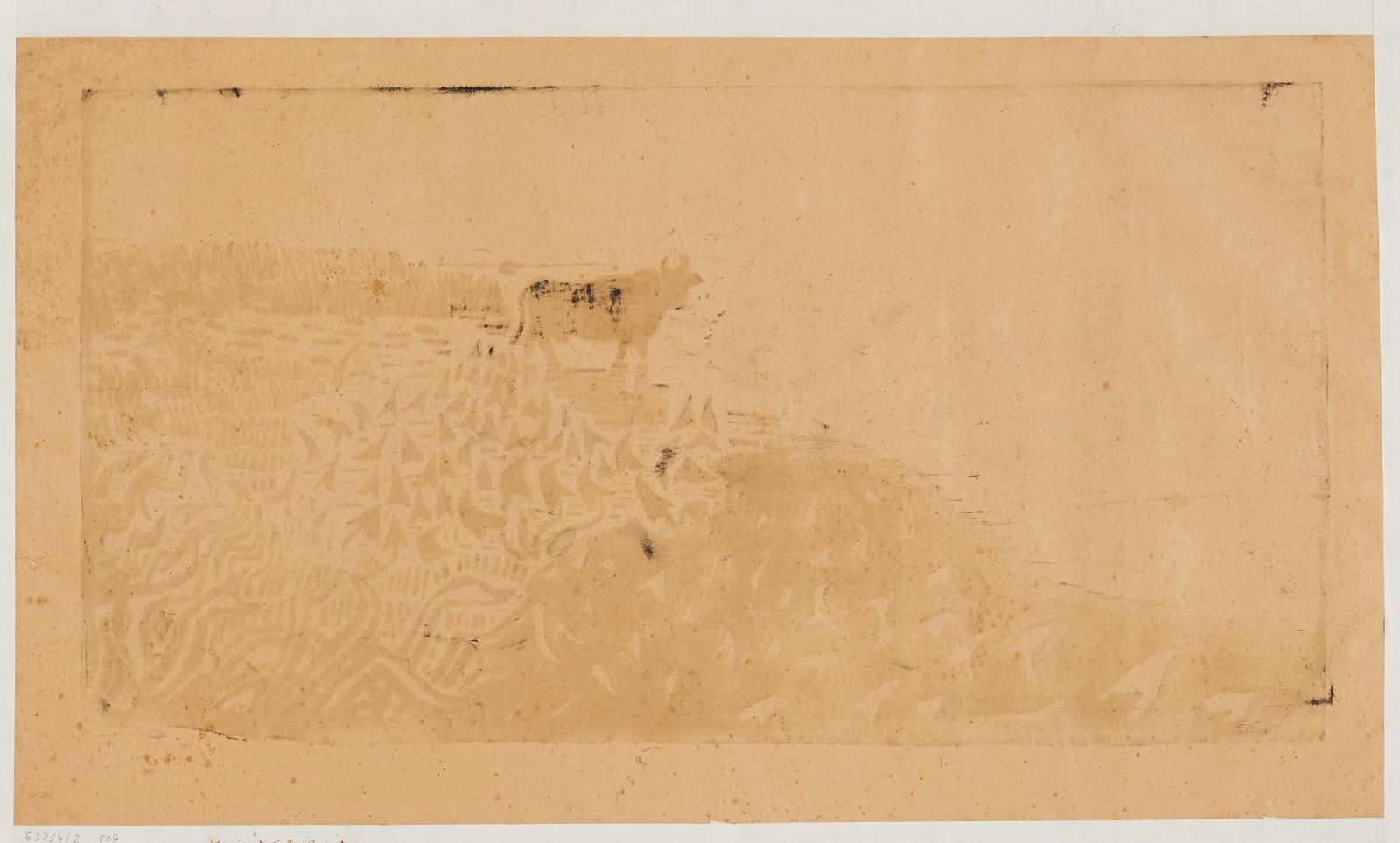 Kuh geht ins Wasser. 1950. Farbholzschnitt auf Bütten (Wasserzeichen). 37 x 70cm (48 x 78,5cm). Signiert. Rahmen. - Umlaufend Reste alter Montierung.