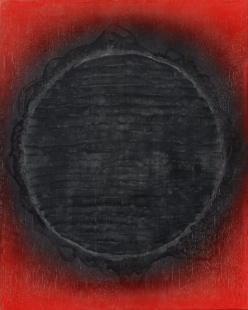 "red fire flower". 1961/63. Mischtechnik auf Leinwand. 100 x 80cm. Signiert und datiert verso auf Leinwand: Piene(eingekreist) 61, durchgestrichen. Nochmals signiert und datiert auf dem Keilrahmen oben: Piene(eingekreist) 61/63. Links daneben betitelt. Rahmen.