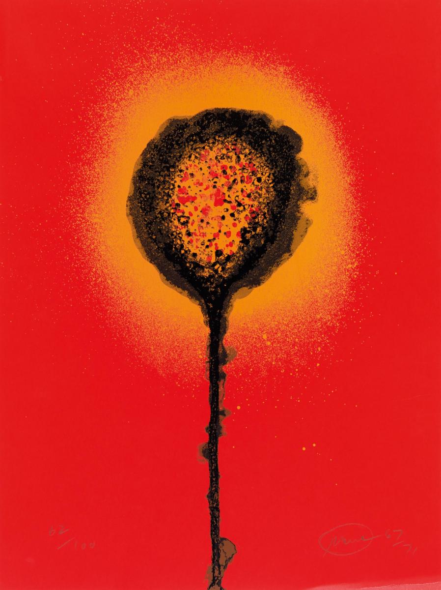 Feuerflora. 1967/71. Farbserigrafie auf Karton. 40 x 30cm Signiert, datiert und nummeriert. Galerie Heseler, München (Hrsg.). Ex. 62/100. - Knick (ca. 6cm) in der unteren rechten Ecke. Verso leichte Verschmutzungen. Reste und Spuren alter Montierungen im oberen Randbereich.