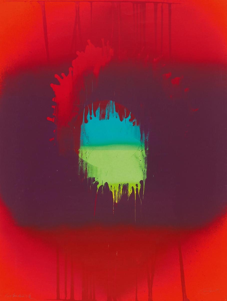 Ohne Titel. 1971. Farbserigrafie auf leichtem Karton. 90 x 68,5cm Signiert, datiert und bezeichnet. Galerie Heseler, München (Hrsg.). Ex. Probedruck. - Minimale Oberflächenbereibungen und Griffspuren. Leichte Knickspur in der unteren linken Ecke. Bestoßungen an den Kanten. Einriss (ca. 0,5cm) an der rechten Kante. Verso Farbspuren und Verschmutzungen.