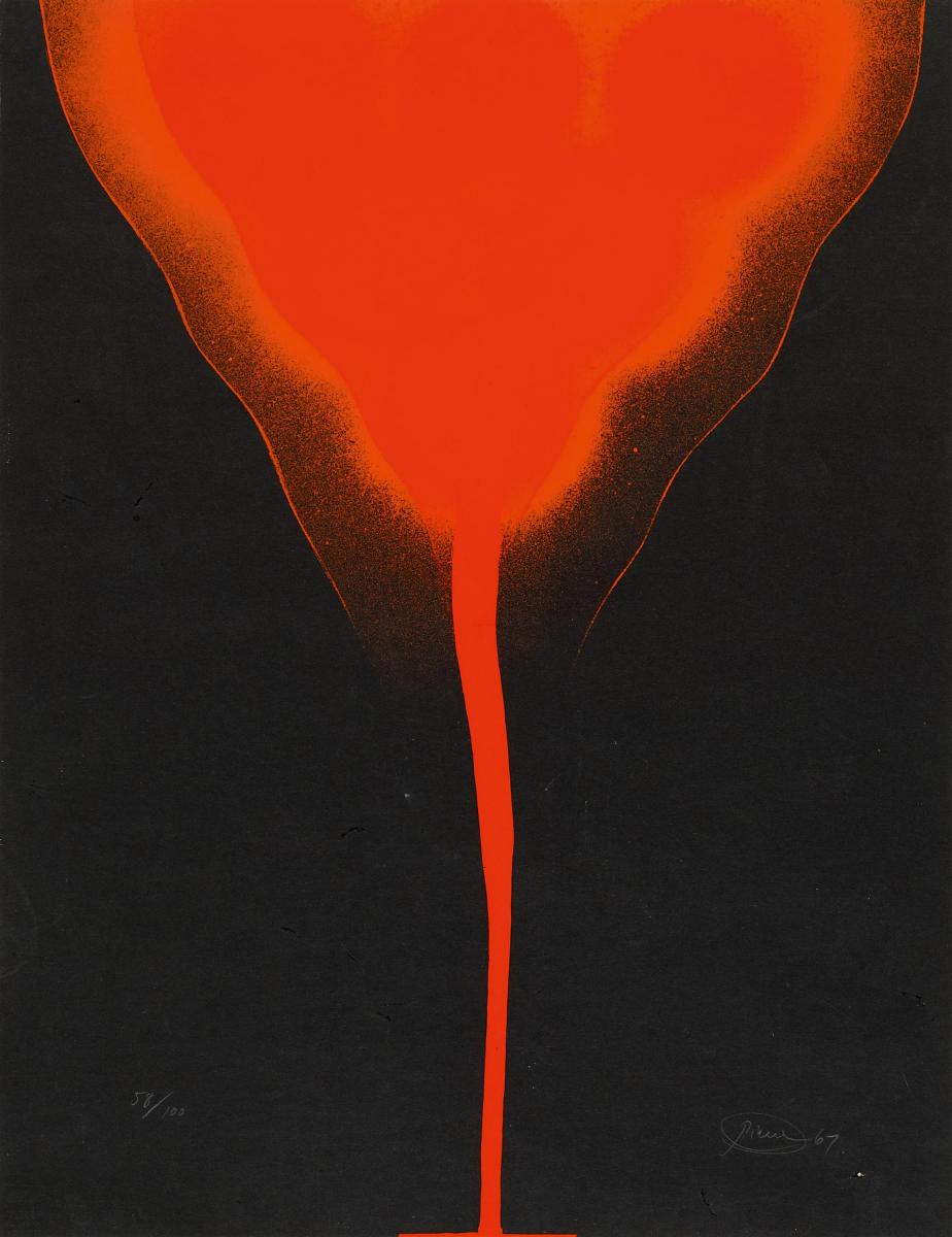 Ohne Titel. 1967. Farbserigrafie auf leichtem schwarzen Tonkarton. 65 x 46cm (65 x 50cm). Signiert, datiert und nummeriert. Galerie Thomas, München (Hrsg.). Ex. 58/100. Rahmen. - Leichte Oberflächenbereibungen bzw. -aufriebe. Kleines Loch im unteren rechten Eckbereich. Kratzspuren, davon eine mit kleinem Blattdurchbruch an der unteren rechten Kante. Verso im oberen Blattbereich montiert.