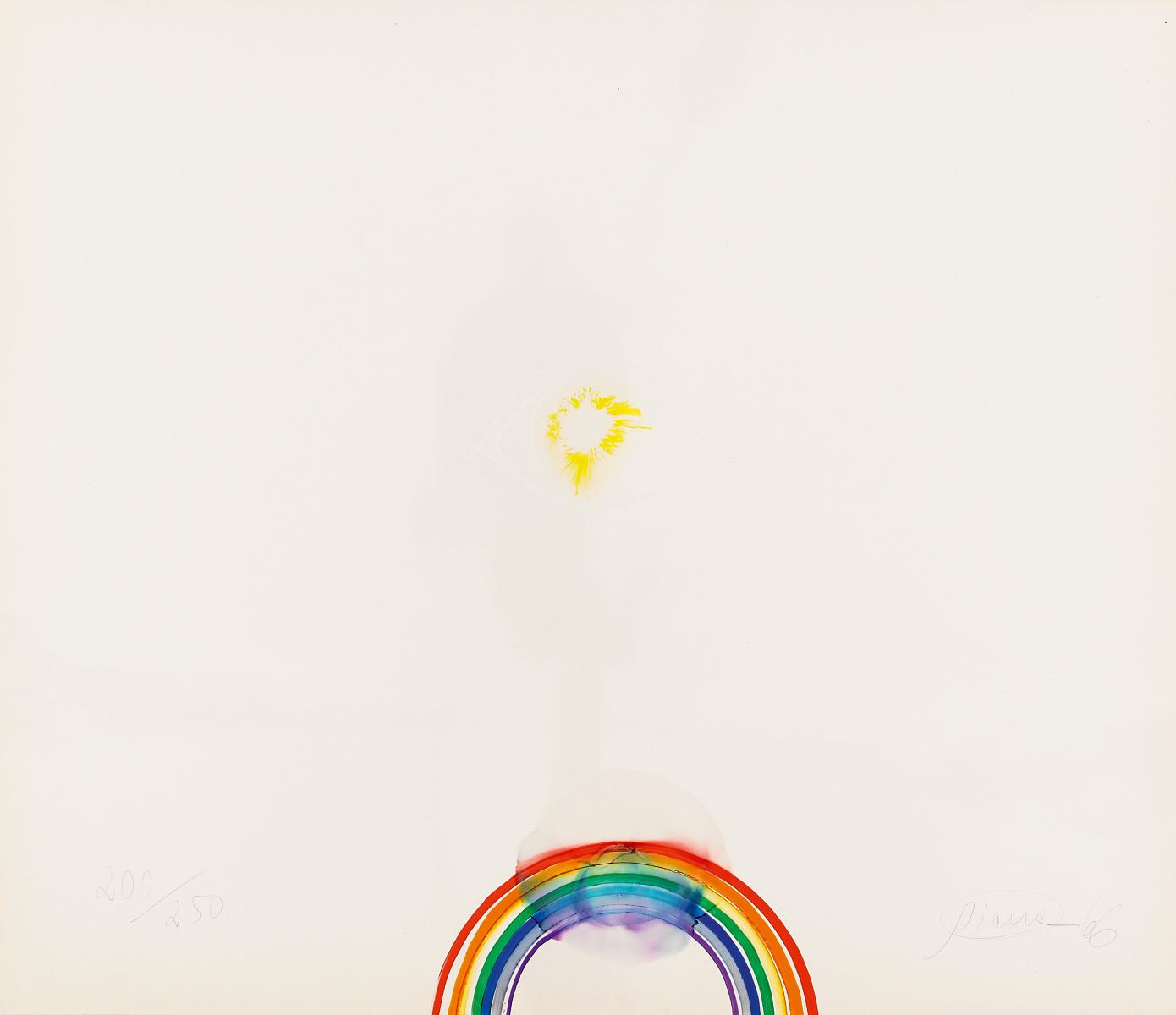 Ohne Titel. 1966. Farbserigrafie, Prägedruck und Sprühfarbe auf Chromoluxkarton. 33 x 20,5cm (53,5 x 63cm). Signiert, datiert und nummeriert. Kestner-Gesellschaft Hannover (Hrsg.). Ex. 200/250. - Minimale Knickspuren. Verso in den Randbereichen minimal gebräunt. Leichte Farbspuren.