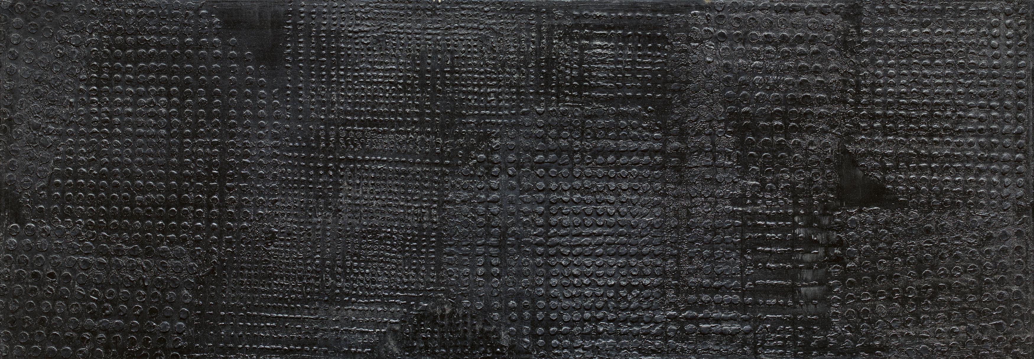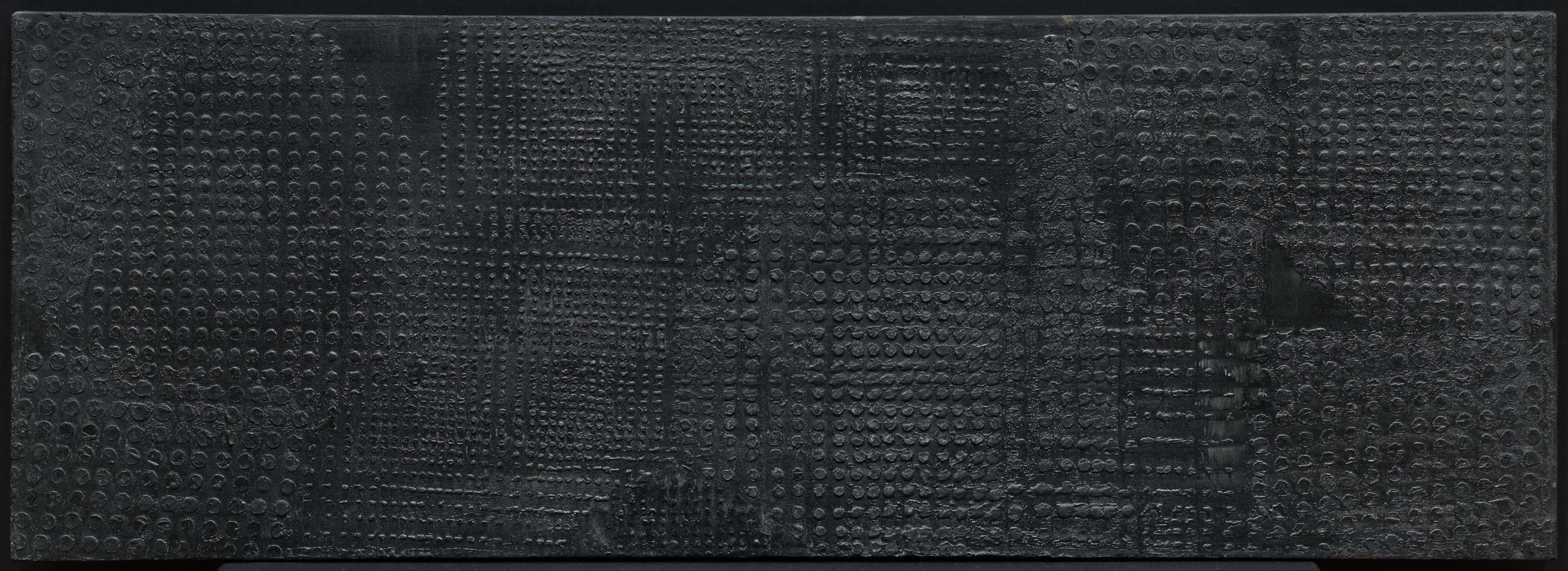 Das 1958 entstandene, schlanke Querformat zeigt eine nahezu vollständig schwarze Fläche, die von einem fein strukturierten Raster aus erhabenen Punkten und subtil modulierten Strukturen überzogen ist. Die fast reliefartige Gestaltung erzeugt ein sensibles Spiel des Lichts auf dem schwarzen Bildgrund. In der Wechselwirkung von Ordnung und Unregelmäßigkeit entfaltet sich eine spannungsvolle Dynamik - eine lebendige, vibrierende Oberfläche.