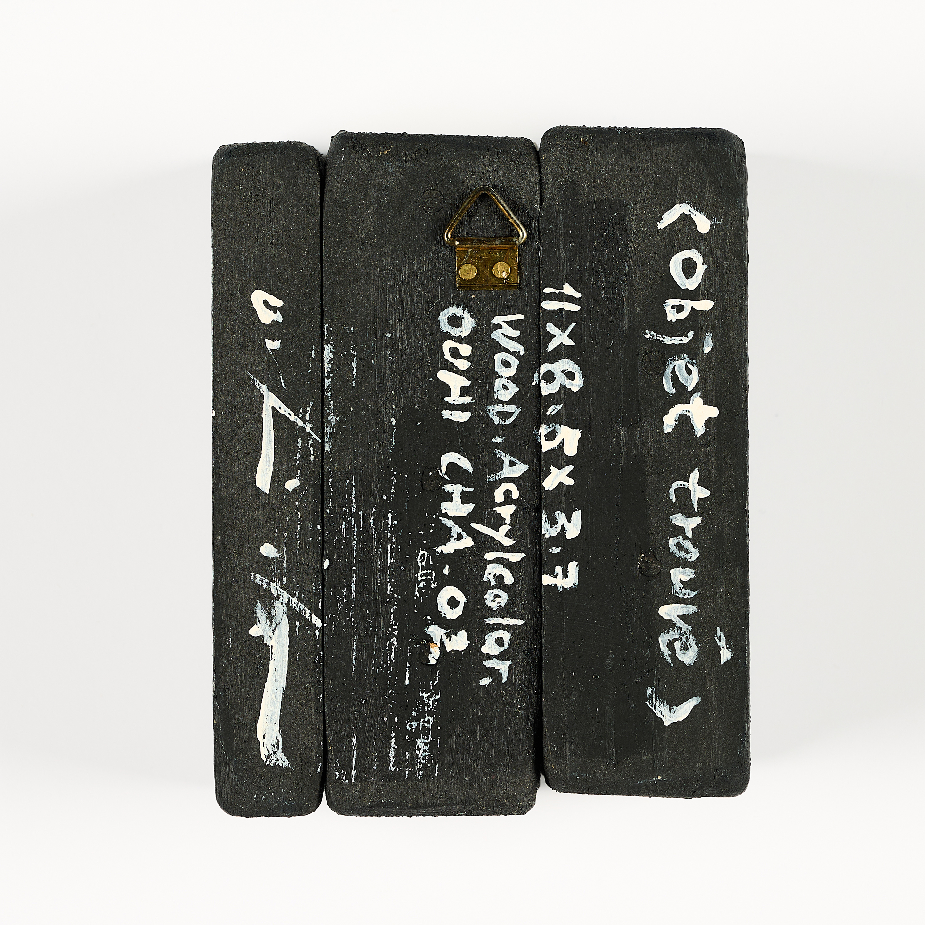 Bezeichnung: Betitelt, bezeichnet und zweifach signiert verso: objet trouvé 11x8,5x3,7 WOOD. Acrylcolor. OUHI CHA. 02.