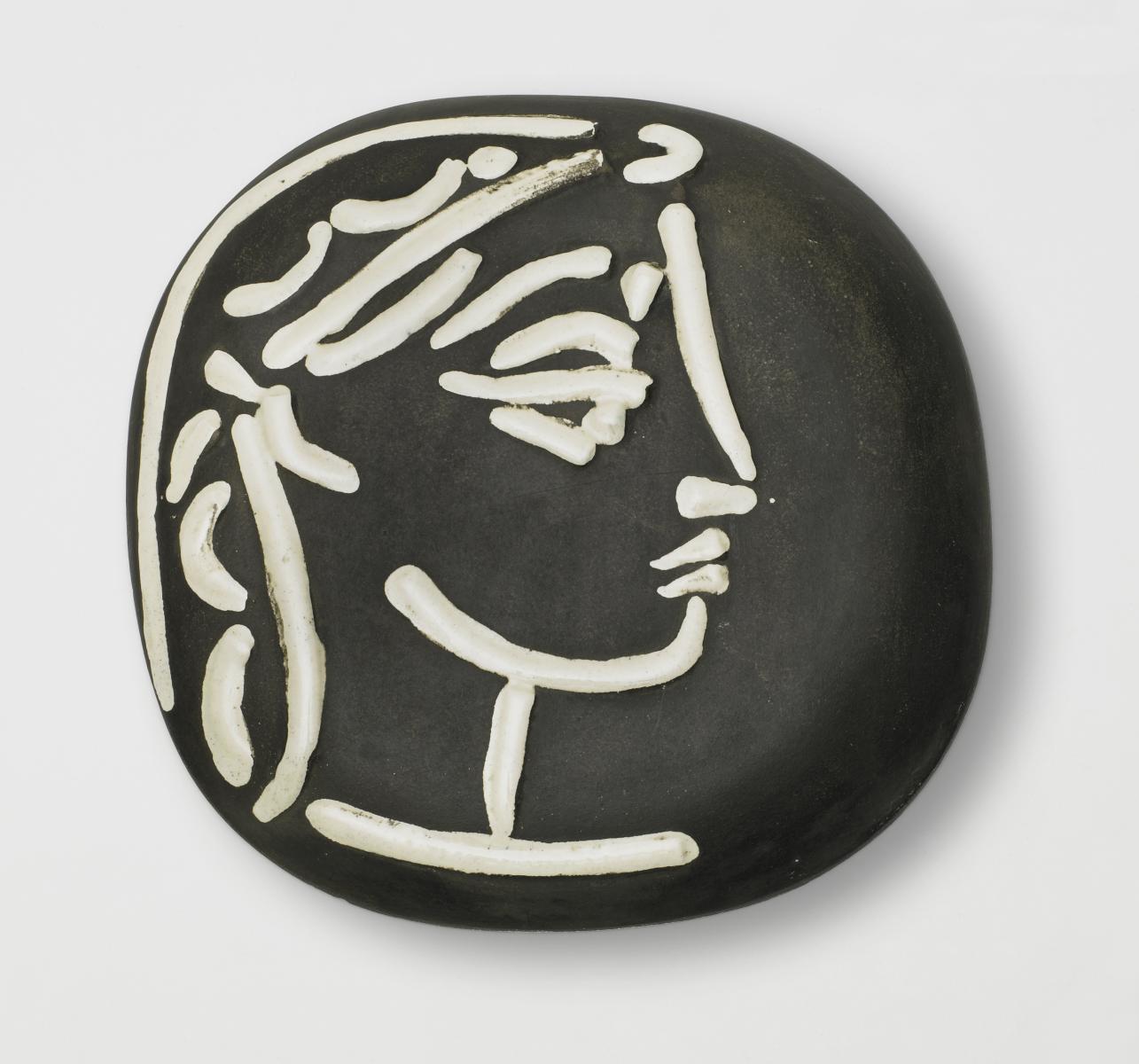 Profil de Jacqueline. 1956. Weißes Steingut, braun gefasst und partiell glasiert. 19 x 19 x 2cm. . Eines von 500 Exemplaren. Gestempelt auf der Rückseite: Madoura Plein Feu, Empreinte Originale de Picasso, Edition Picasso.