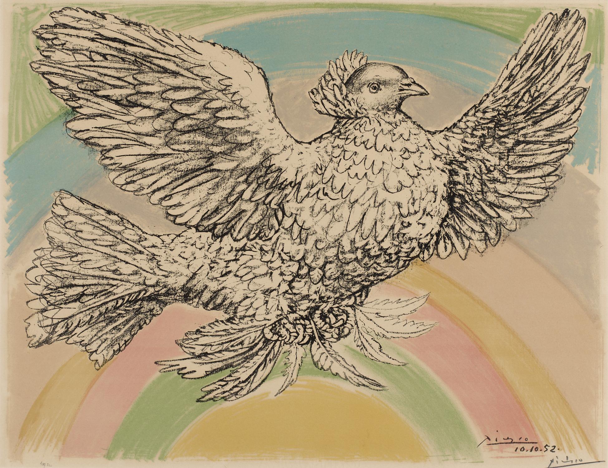 Colombe volant (a l'arc-en-ciel). 1952. Farblithographie auf Arches Velin (Wasserzeichen). 51,5 x 66,5cm Ex. 100/200. Signiert, und nummeriert sowie im Stein ein weiteres Mal signiert und datiert. - Blatt gleichmäßig gebräunt. Farben verblichen. Verso entlang der Ränder auf den Untergrund montiert.