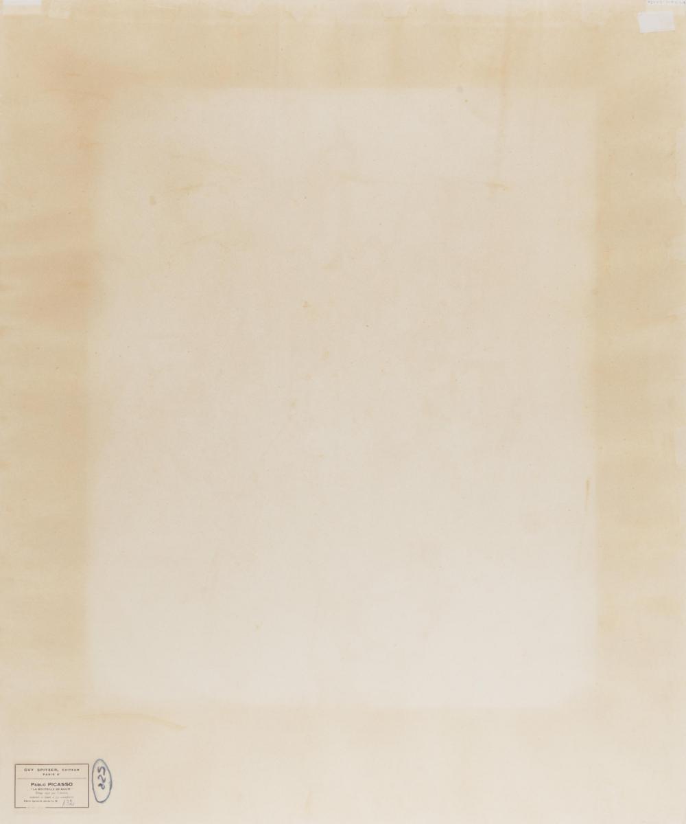 Zustand: Blatt recto und verso ungeregelmäßig gebräunt. Bräunliche Flecken (z.T. Wasserflecken) in den Randbereichen. Verso leicht stockfleckig sowie Spuren und Reste alter Montierung an der oberen Blattkante.