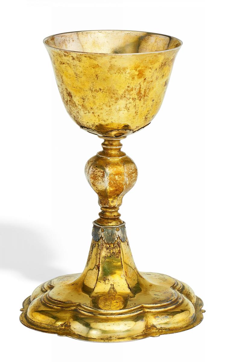 Beschau für Paderborn (Scheffler, Rheinland-Westfalen, Nr.1127), Meistermarke I.S. (Johan Stüker, wohl 1686-1733, ebd. Nr.1136). Auf dem Fußrand Zahl XII graviert. Zustand A/B. Beilage: Patene. Silber, vergoldet.