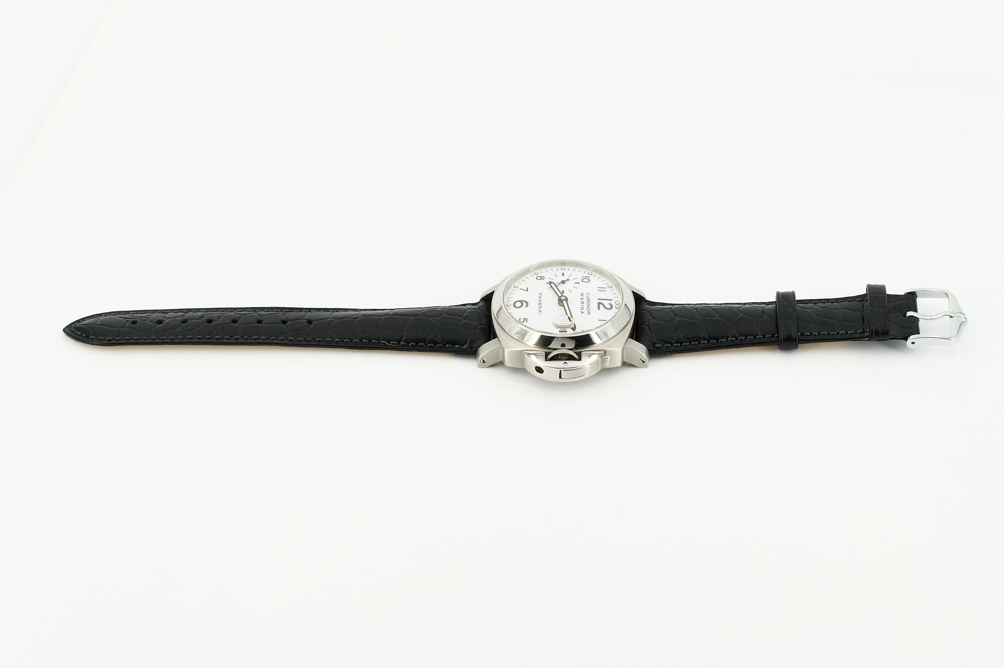 Gehäuse/Armband: Stahl, Lederarmband mit Dornschließe, Zffbl. weiß, Zeiger und arabische Ziffern schwarz, Leuchtmasse.