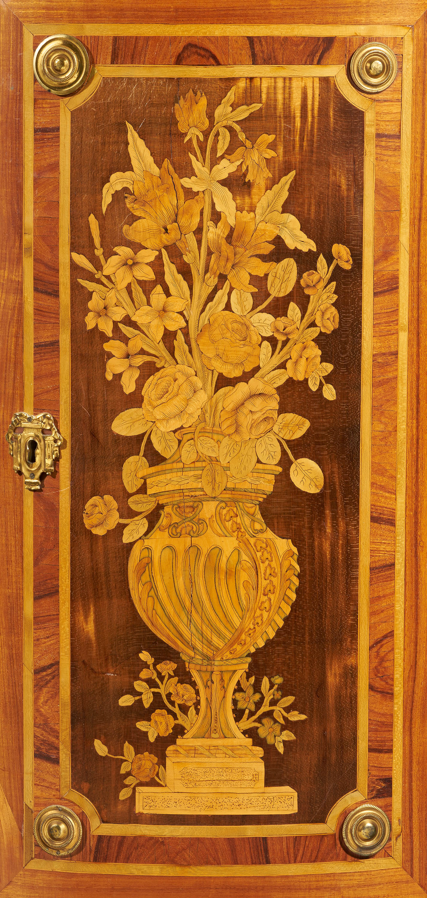 Beschreibung: Eintüriger Korpus mit reichem floralem Dekor in Form eines Blumenbouquets in einer
