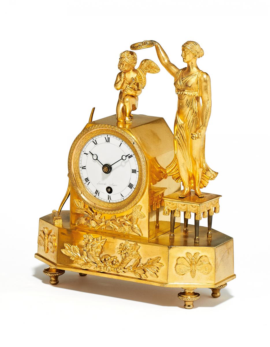 Vergoldete Bronze. Emailzifferblatt. Venus Amor mit einem Kranz bekrönend. Kleines Achttage-Gehwerk mit Fadenaufhängung. Höhe 21cm. Zustand B. Beilage: (P/S).