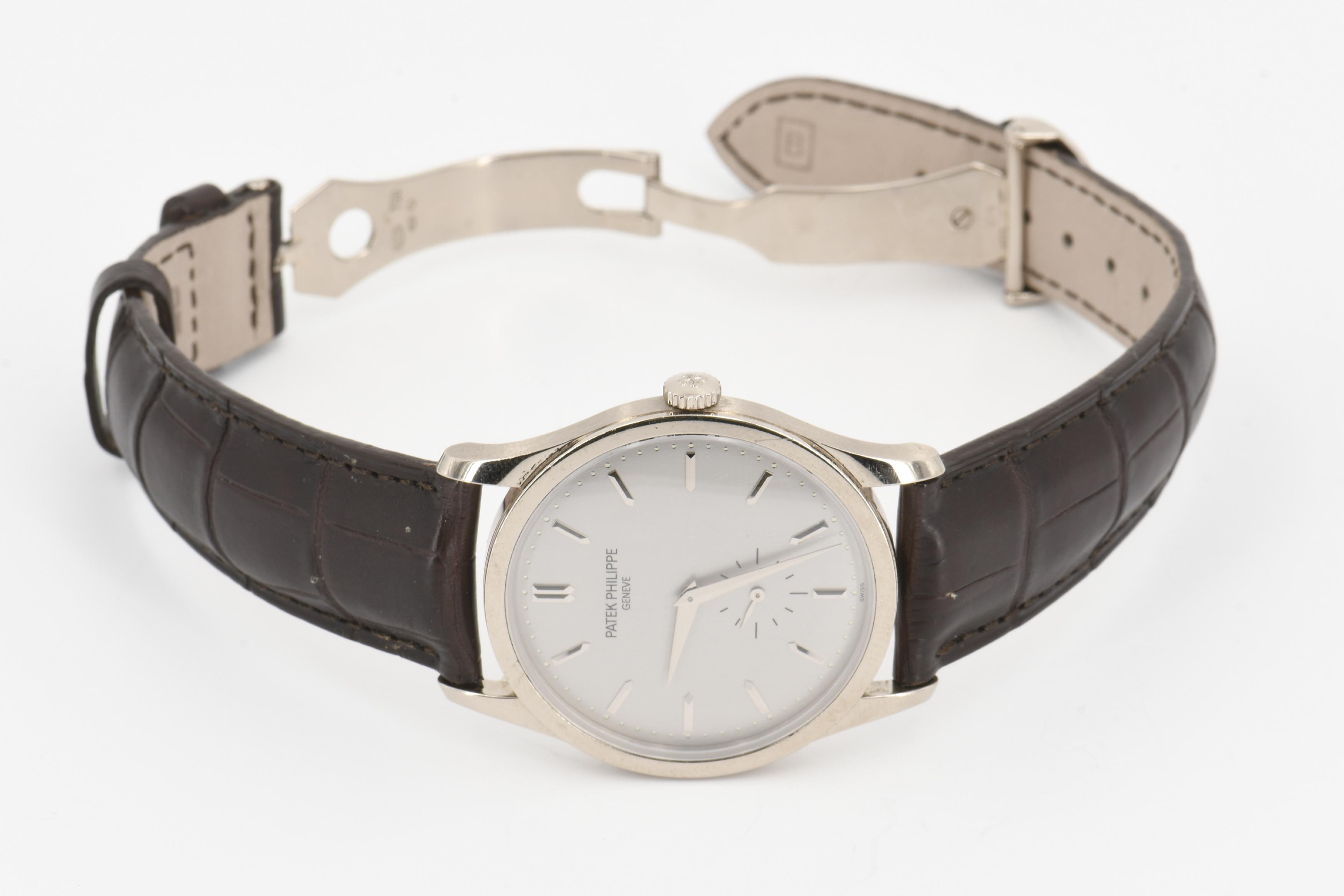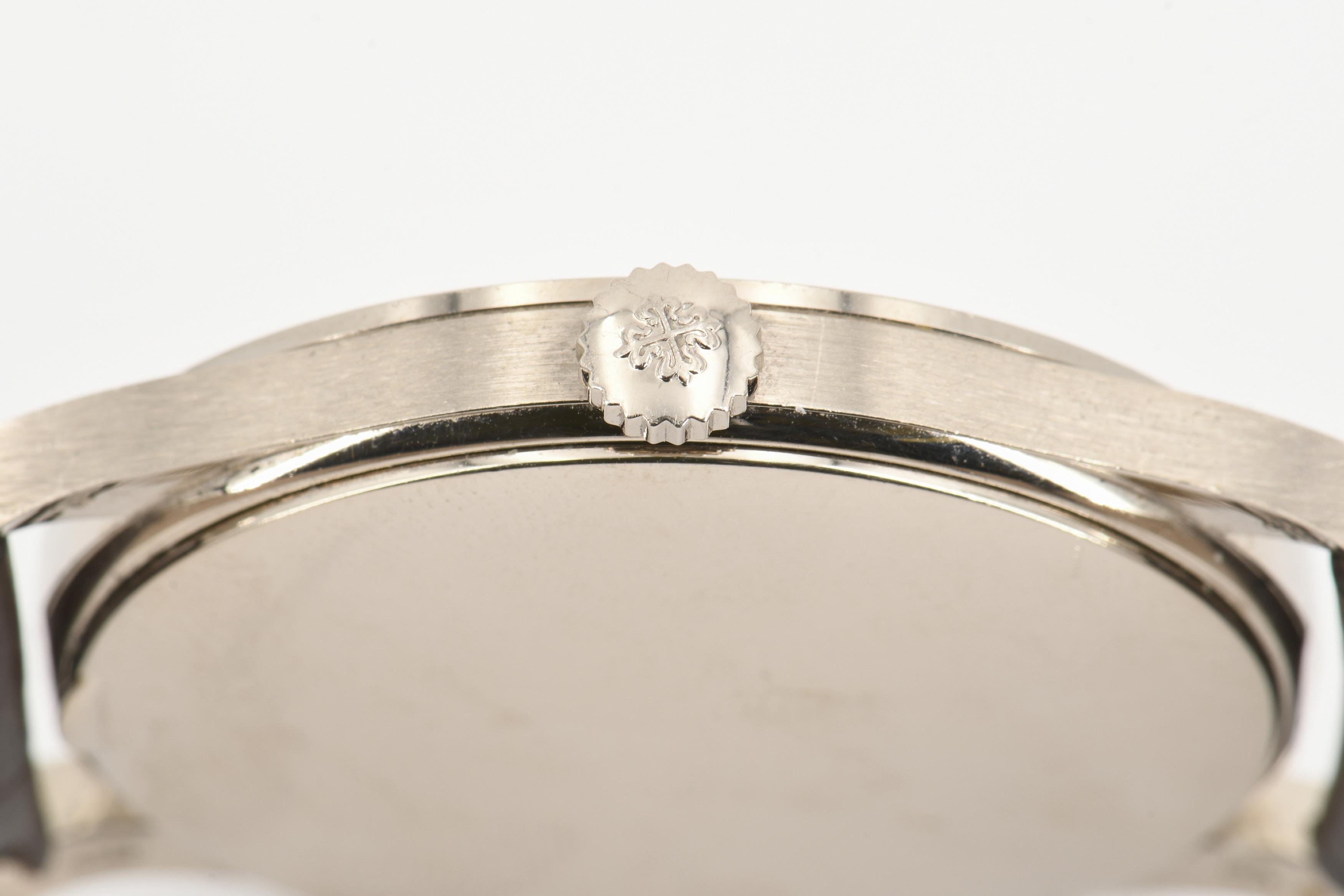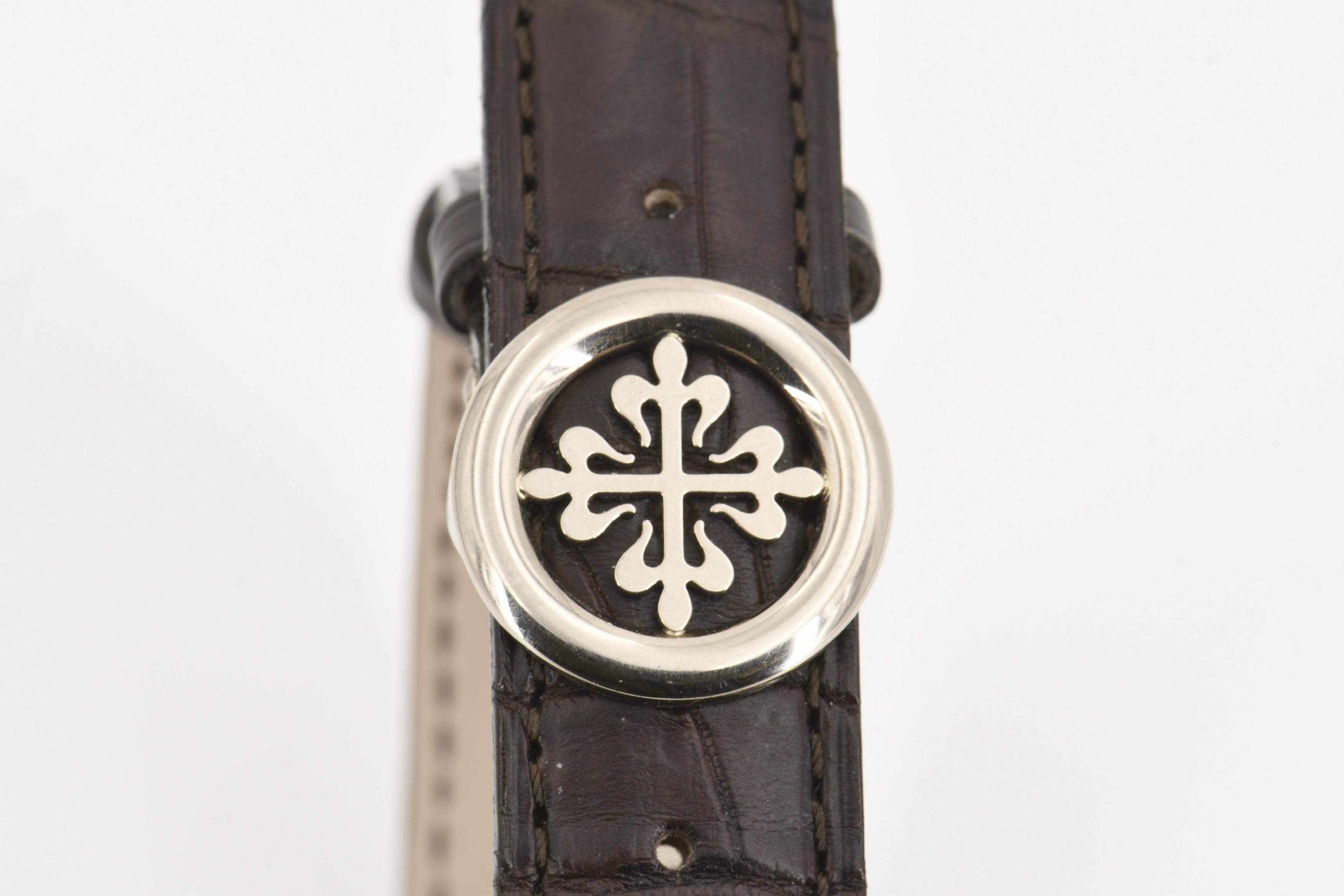 Gehäuse/Armband: 750/- Weißgold, Lederarmband mit orig. Weißgold-Faltschließe, Zffbl. silbern mit Strichschliff, Zeiger und Indizes silbern.