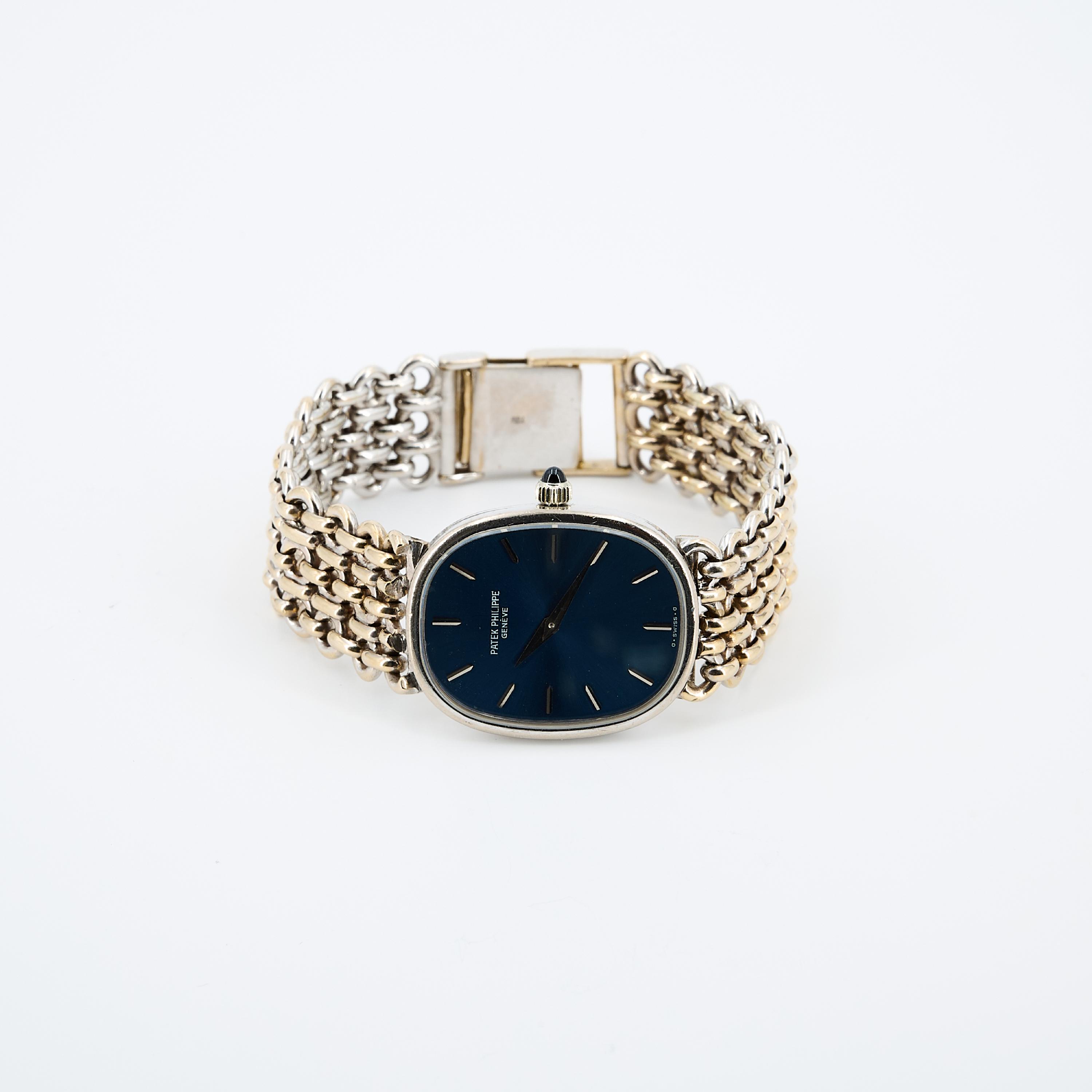 Gehäuse/Armband: 750/- Weißgold, Gliederarmband mit Kastenschloss, Zffbl. blau, Zeiger und Indizes silbern.