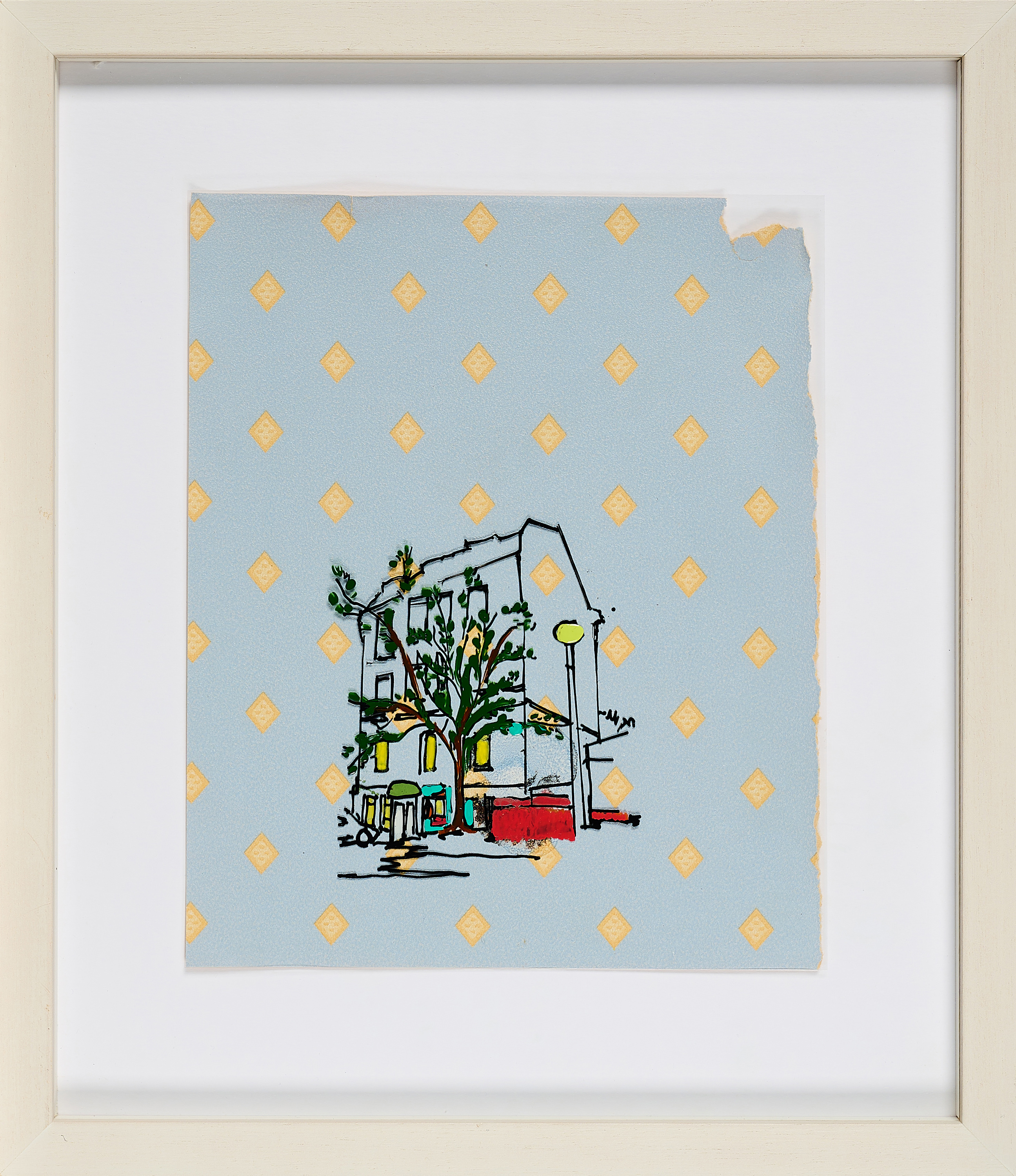 Technik: Jeweils: Lackstift auf Folie auf Tapetencollage.
