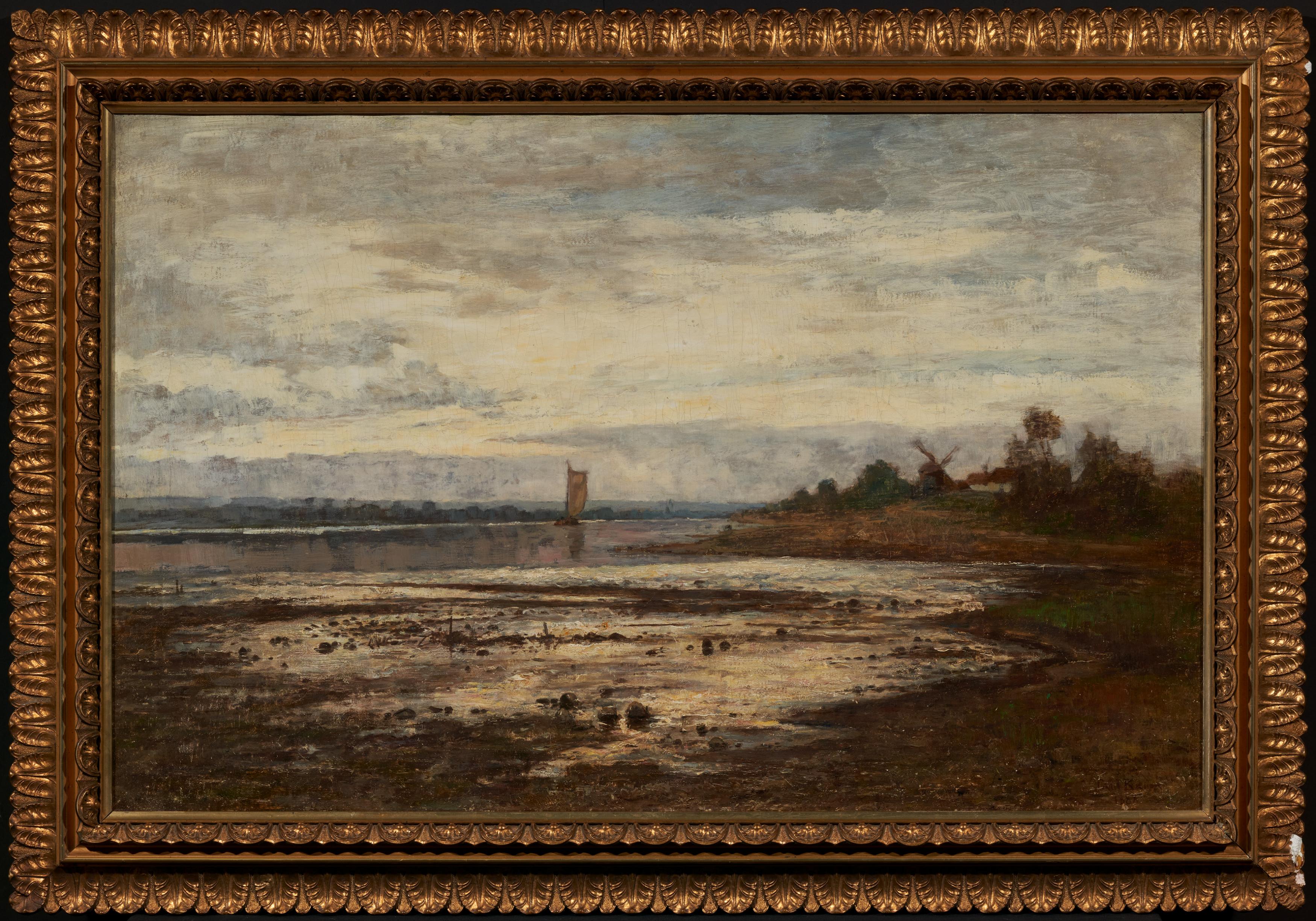 Titel: Flusslandschaft mit Boot und Windmühle.