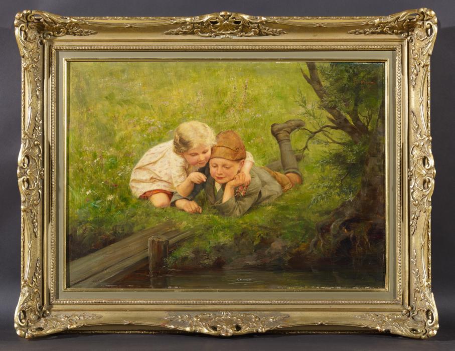 Zwei Kinder am Bachufer. Signiert oben rechts: Paul Wagner M.K. Öl auf Holz. 51 x 72cm. Rahmen.