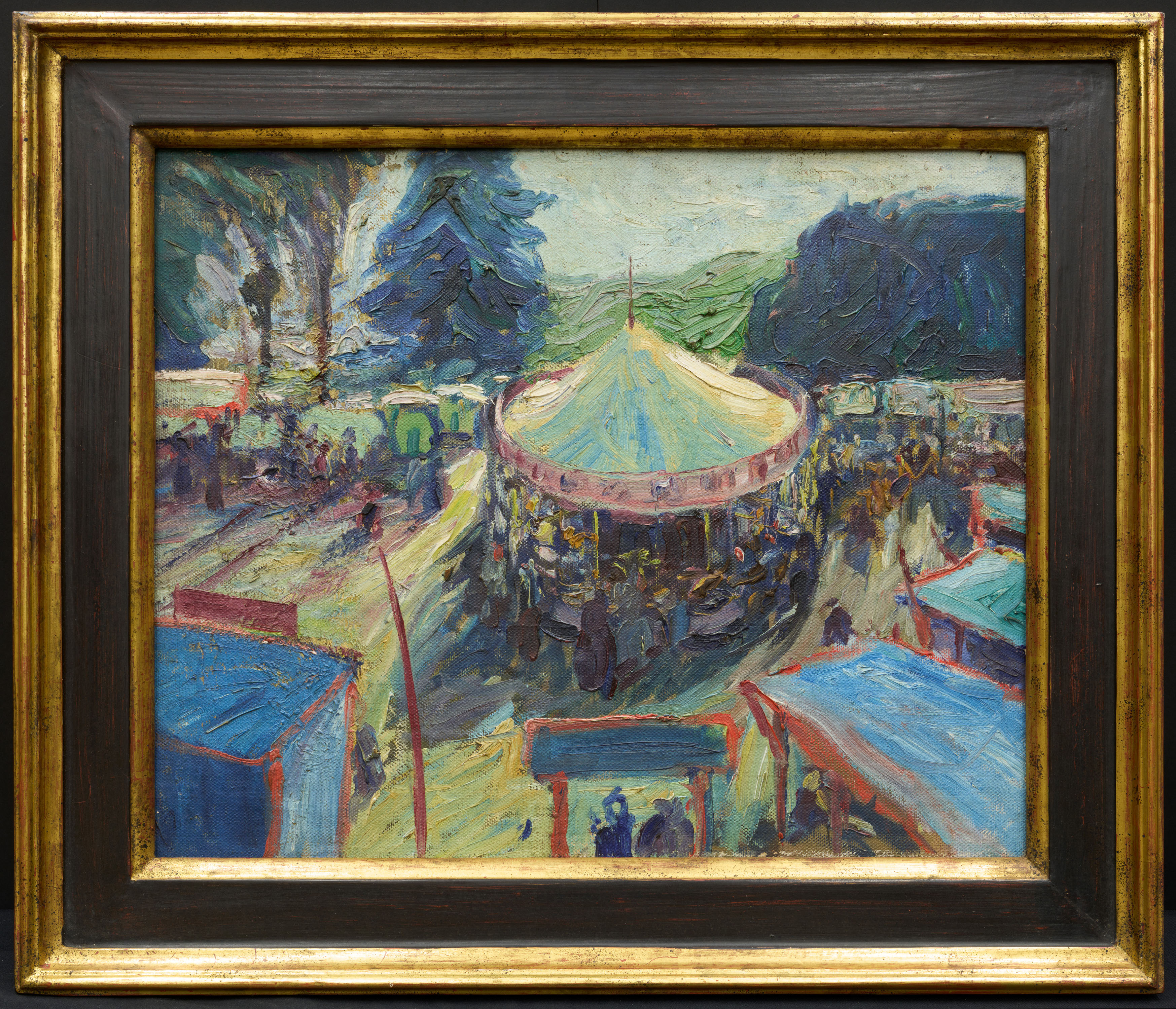 Minimal verschmutzte Malfläche. Minimales Krakelee (werkimmanent). Minimal abgeflachte pastose Stellen. Unter UV-Licht keine Retuschen oder Übermalungen erkennbar. Ansonsten sehr guter Zustand. Im Rahmen beschrieben.