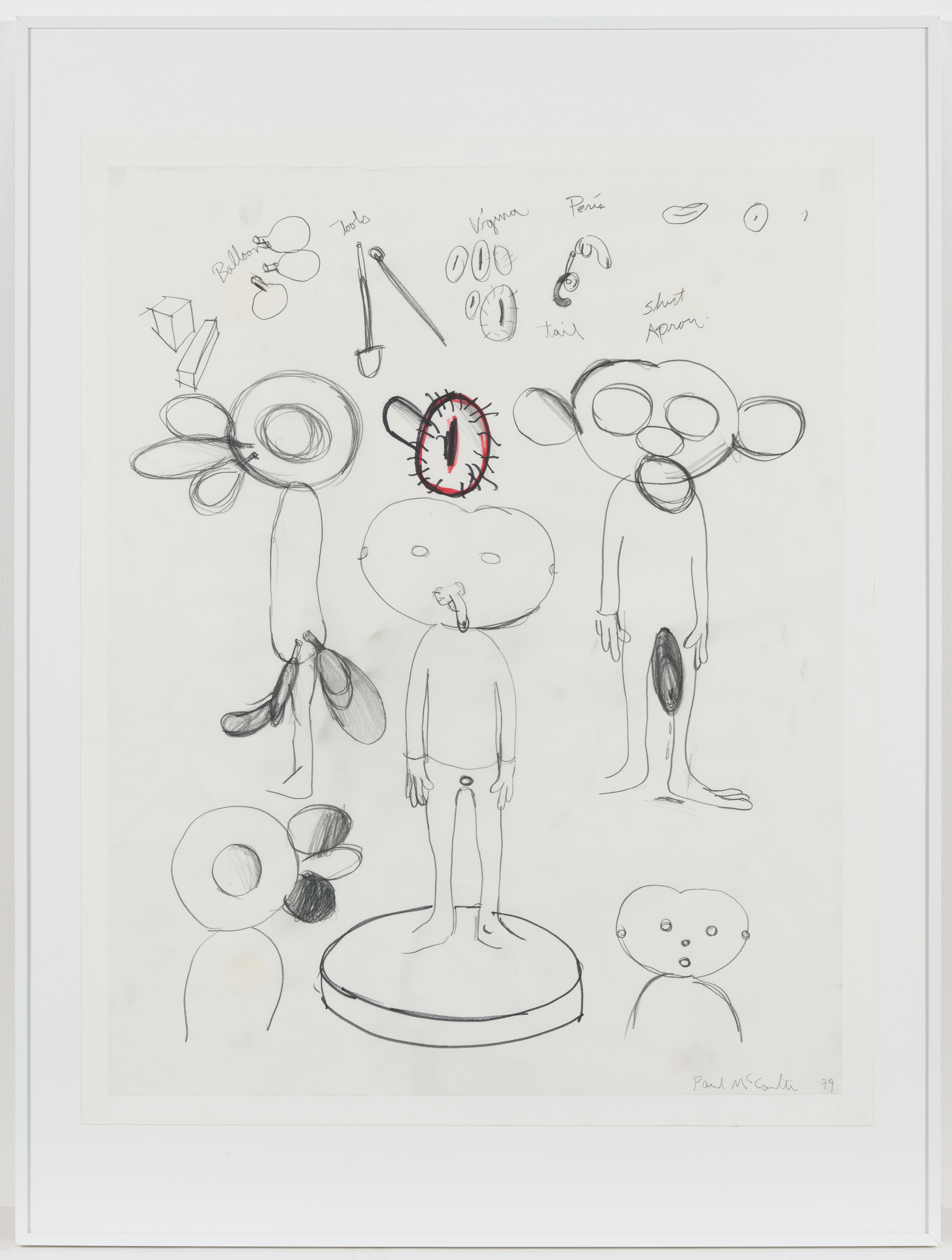 Sein humoristischer Umgang mit Sexualität und Körperlichkeit wird in dem vorliegenden Werk "Ohne Titel" von 1999 deutlich. Der menschliche Körper wird skizzenhaft durch Hinzufügen von Ballons, die vor allem im Mund- und Schambereich angebracht werden, modifiziert. Ähnlich eines medizinischen Schemas hat McCarthy die einzelnen Bestandteile seines fast operativ dargelegten Eingriffes, bei dem die auszutauschenden Körperteile, wie die Geschlechtsteile, die Ersatzteile genutzten Luftballons, sowie die benötigten Werkzeuge (ein angedeutetes Messer und eine Art Schaber), nebeneinander aufgezählt und bezeichnet. Sexualität wird hier, wie in vielen seiner Werke, als etwas Humoristisches, Spielerisches und Wechselhaftes dargestellt.