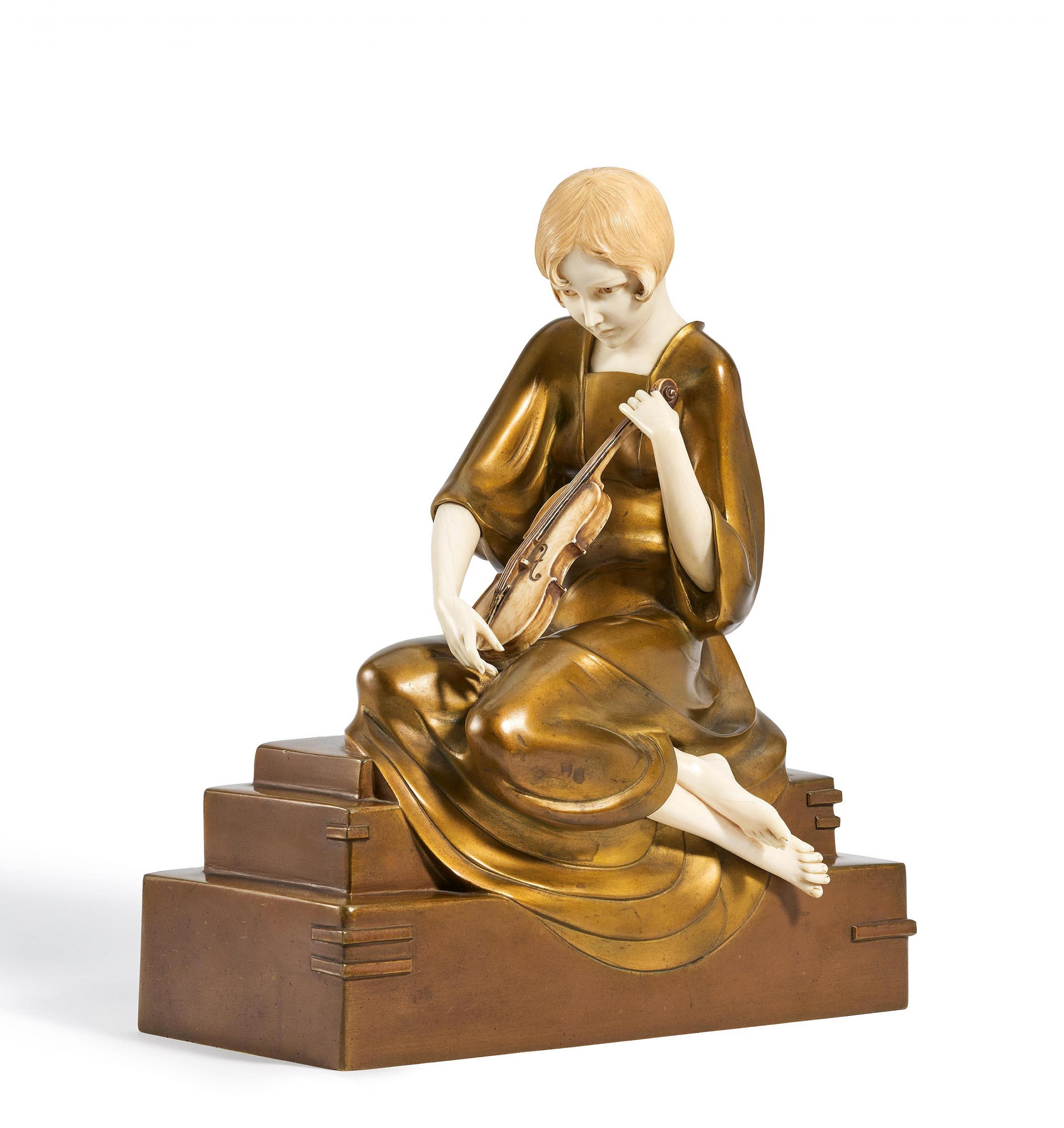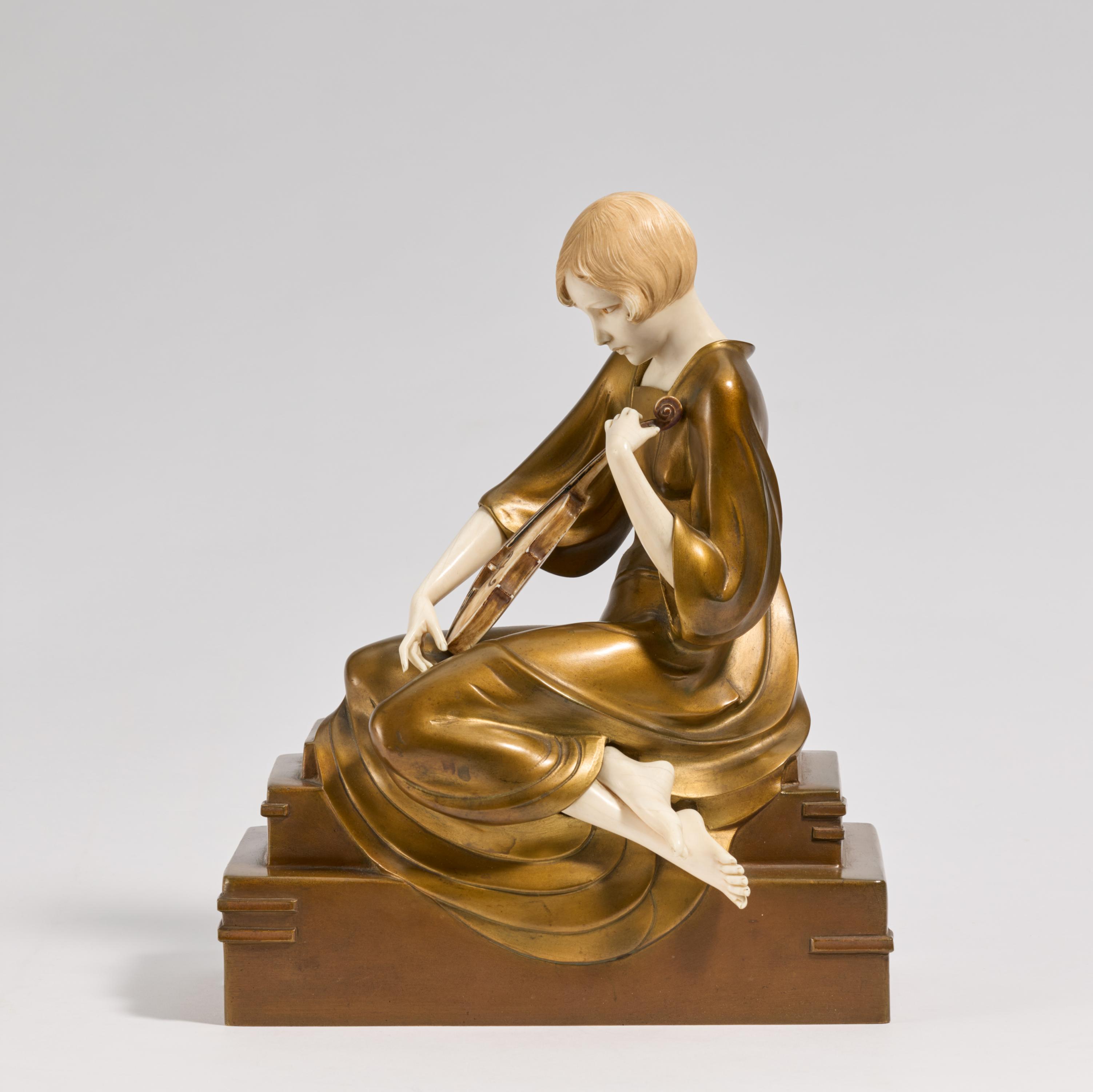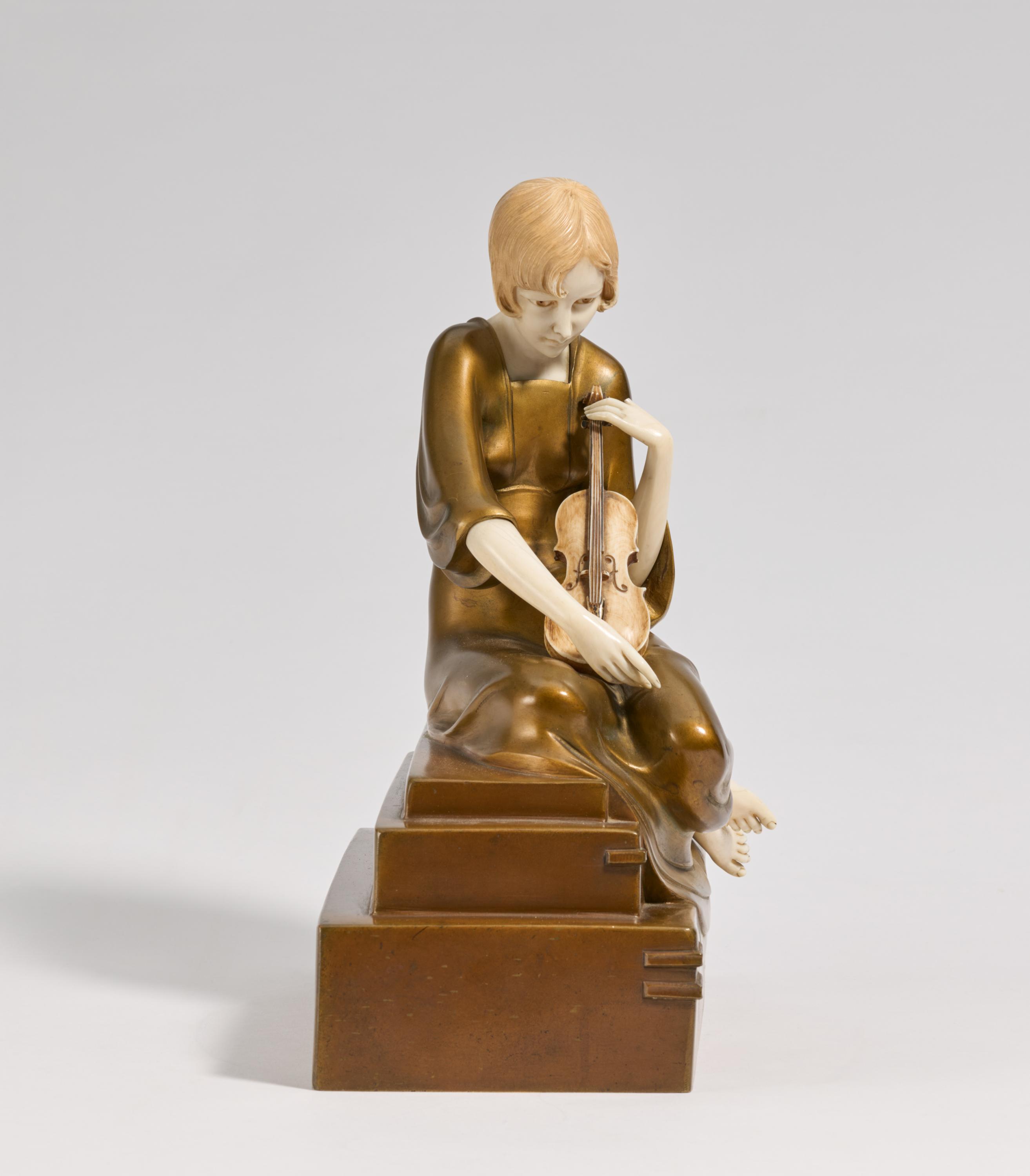 Beschreibung: Auf getrepptem Sockel sitzendes Mädchen, die Violine spielend.