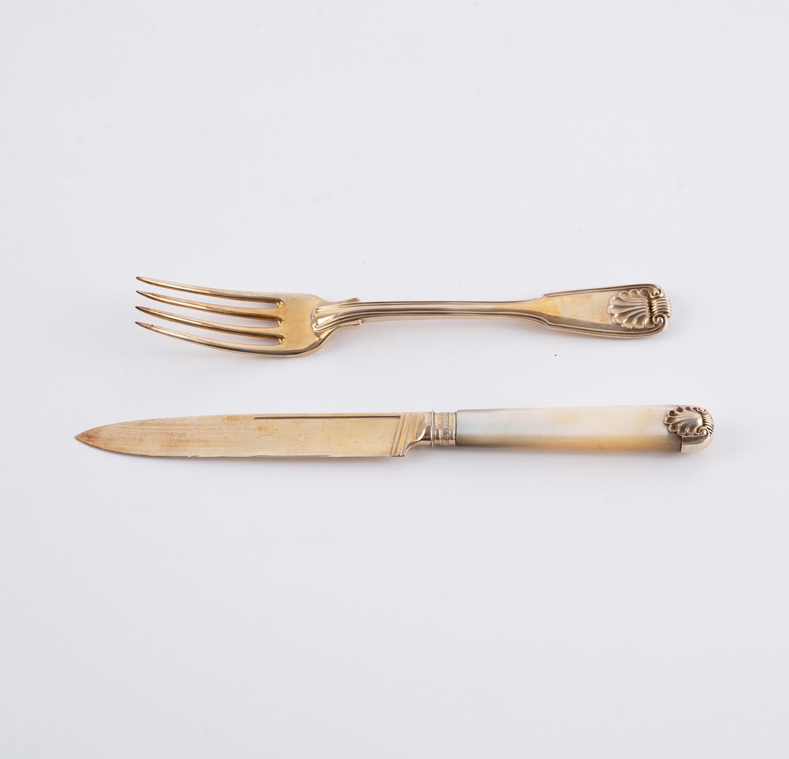 Technik: Silber vergoldet. Die Messer mit Vermeilklinge und Perlmuttgriffen.