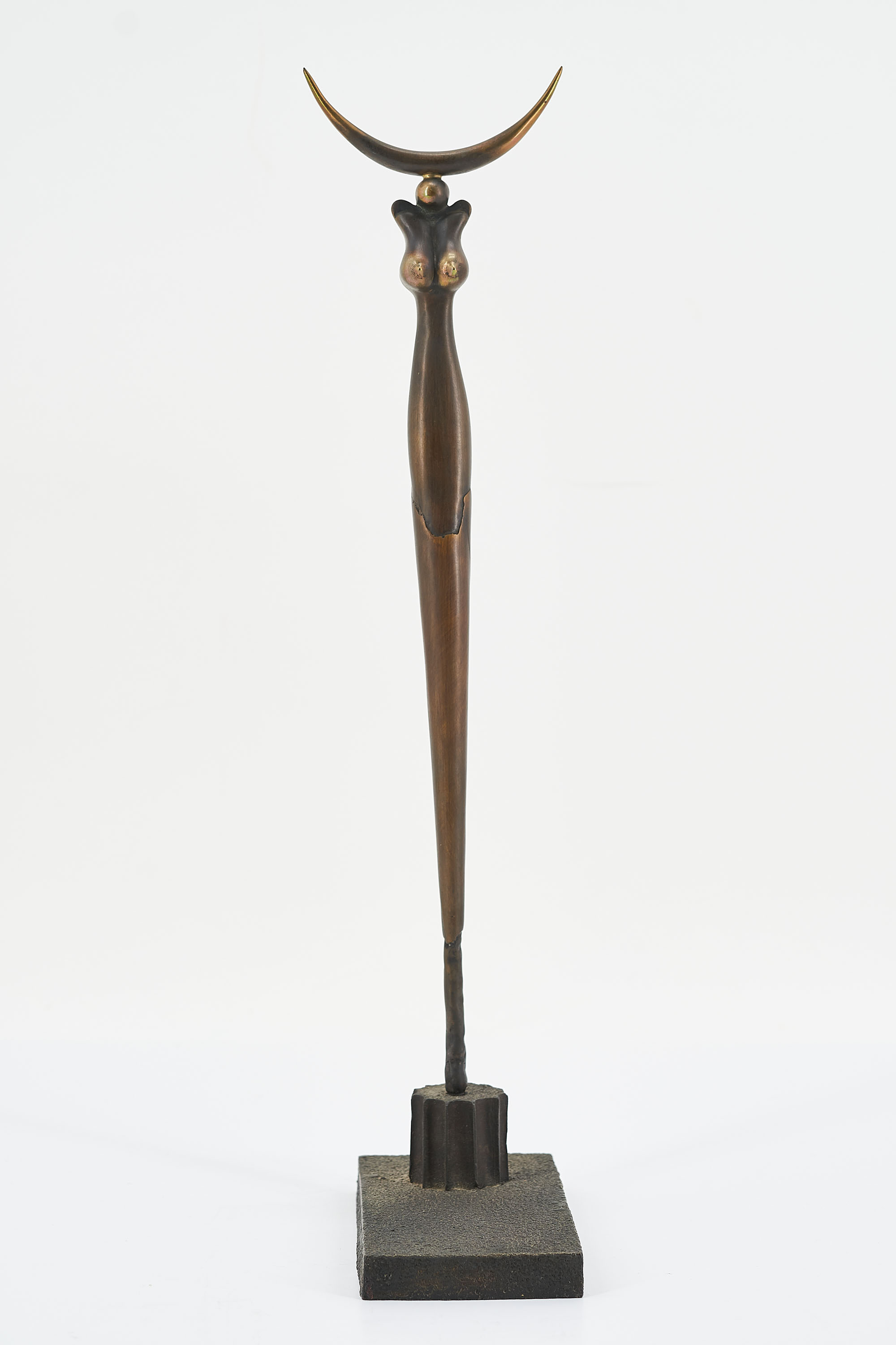 Skulptur neigt sich leicht links. Minimale Staubablagerungen. Punktuell minimal fleckige Patina. Ansonsten sehr guter Zustand.