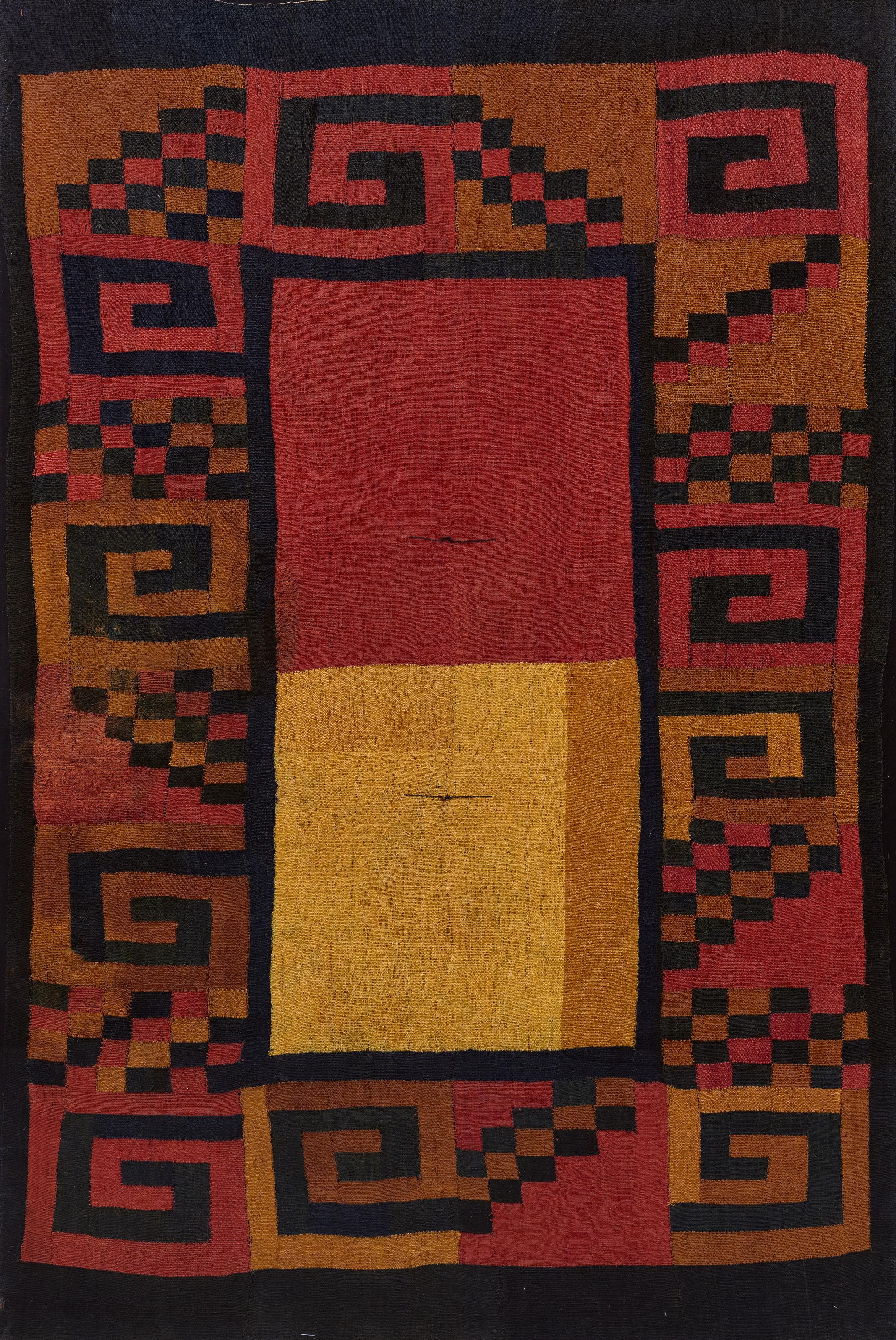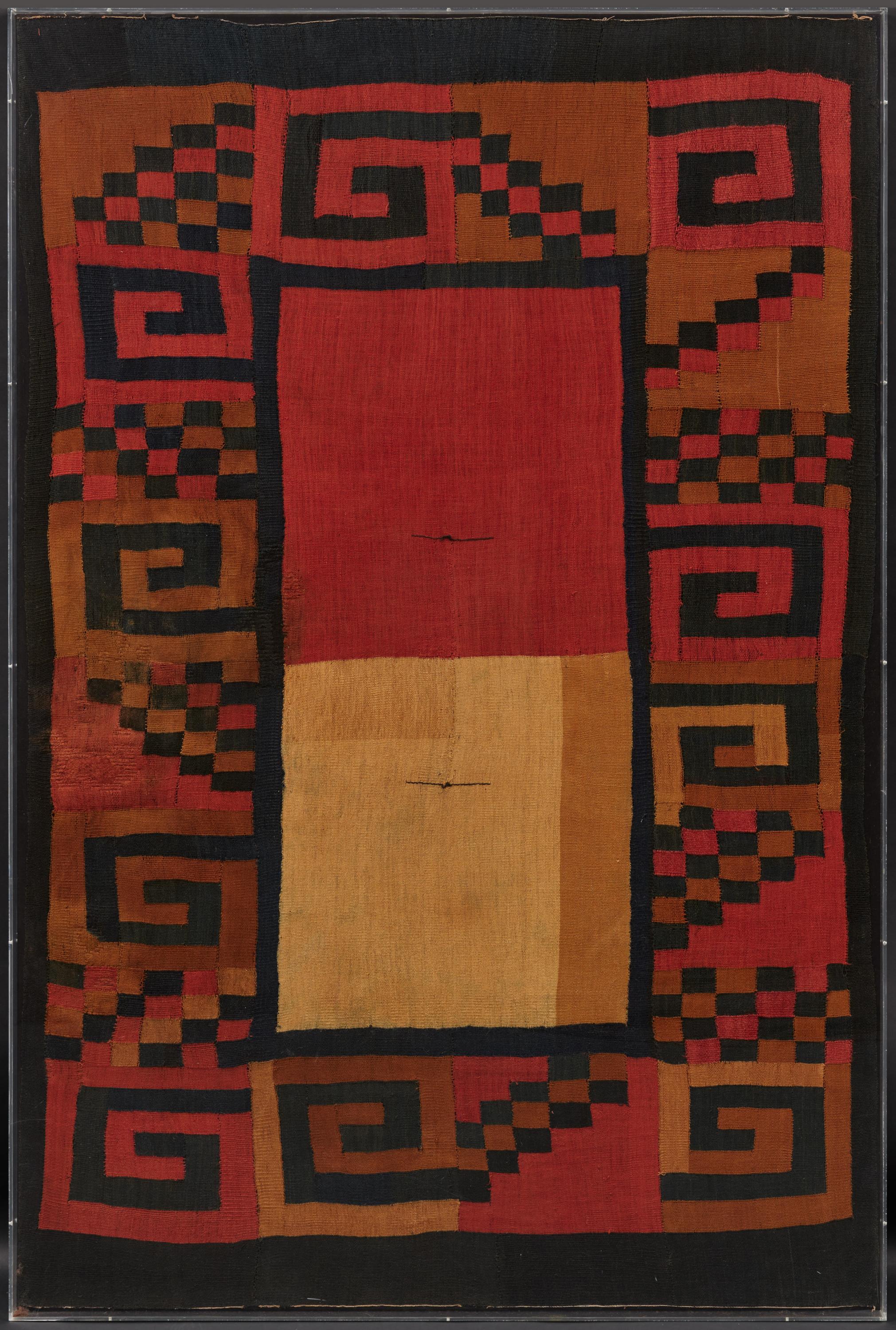 Beschreibung: Geometrisches Dekor in Schwarz, Rot und Orangetönen. Im mittleren, rechteckigen Feld zwei