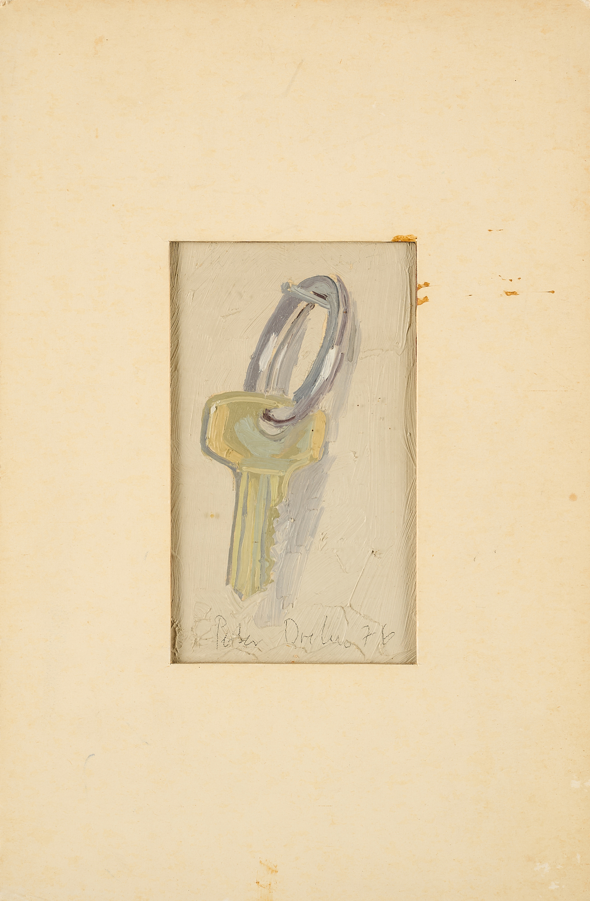 c) Ohne Titel. 1977. Öl auf Karton hinter Plexiglas in ein Passepartout geklebt. Passepartoutausschnitt: 11,5 x 6cm. Passepartout (21 x 14,5cm). Datiert oben: 7.8.77. Verso mit Bleistiftzeichnung, hier signiert und datiert: Peter Dreher 77/78. Zudem gewidmet.