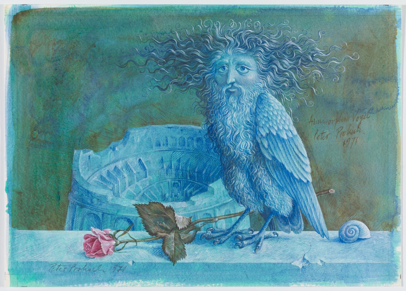 Bezeichnung: Signiert, datiert und betitelt unten links: Peter Proksch 1971 Anamorpher Vogel Peter Proksch 1971.