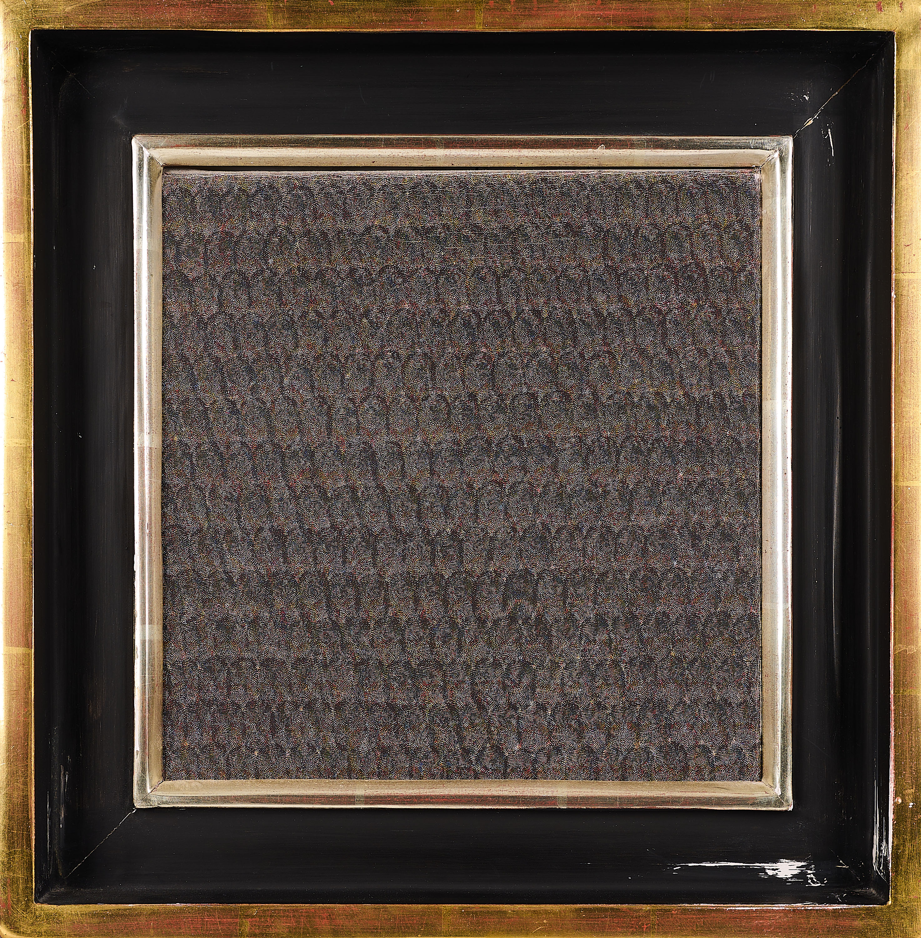Bezeichnung: Betitelt, signiert, datiert und bezeichnet verso: 1er Rhythmus ÜBERLAGERUNGEN BERÜHRUNGEN P. Reichenberger 79 FINGERABDRÜCKE AUF LEINWAND. Sowie gewidmet auf dem Keilrahmen.