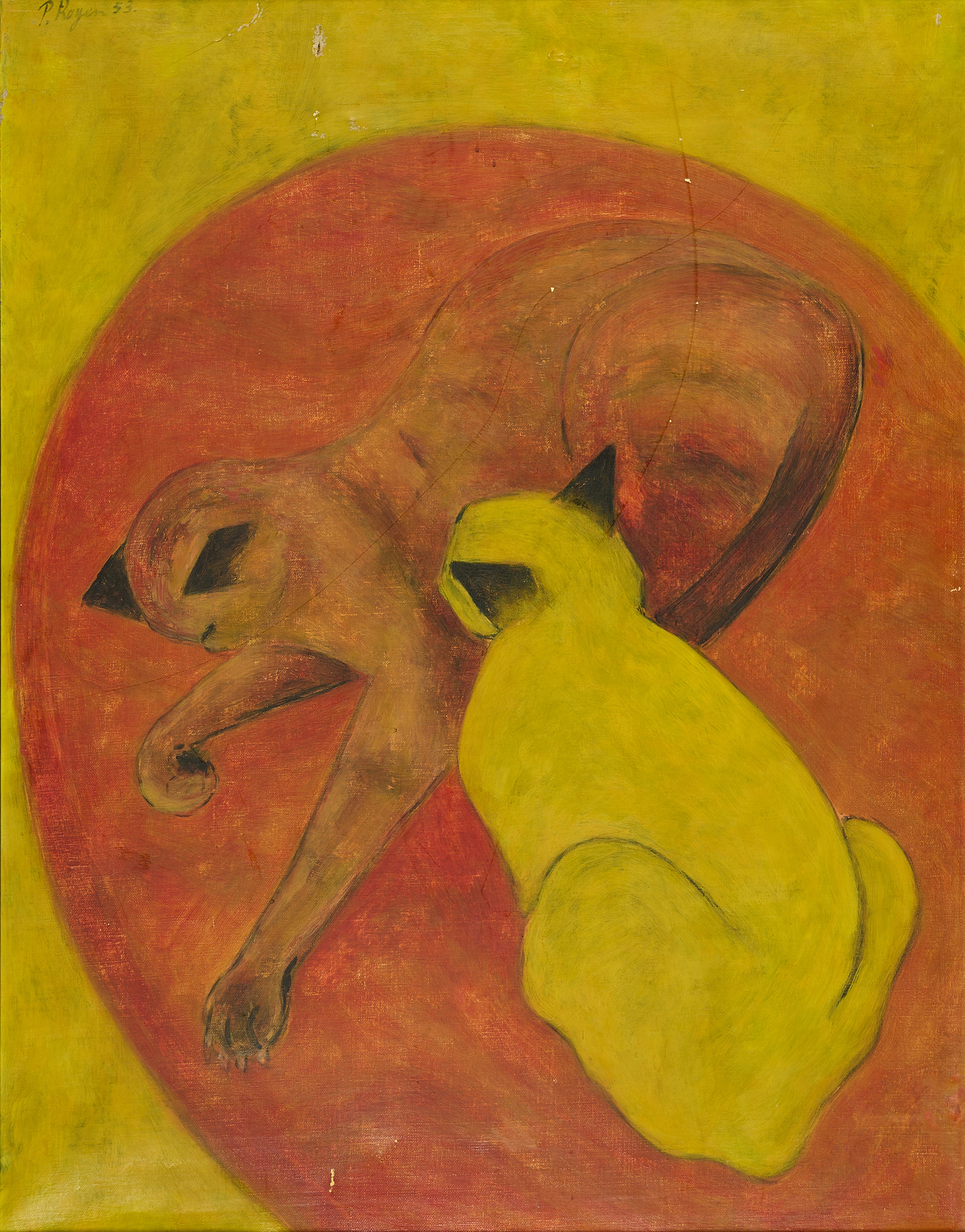 Bezeichnung: Signiert und datiert oben links: P. Royen 53. Sowie signiert und betitelt verso links mittig: Peter Royen "Katzen". Zudem mit Ortsangabe.