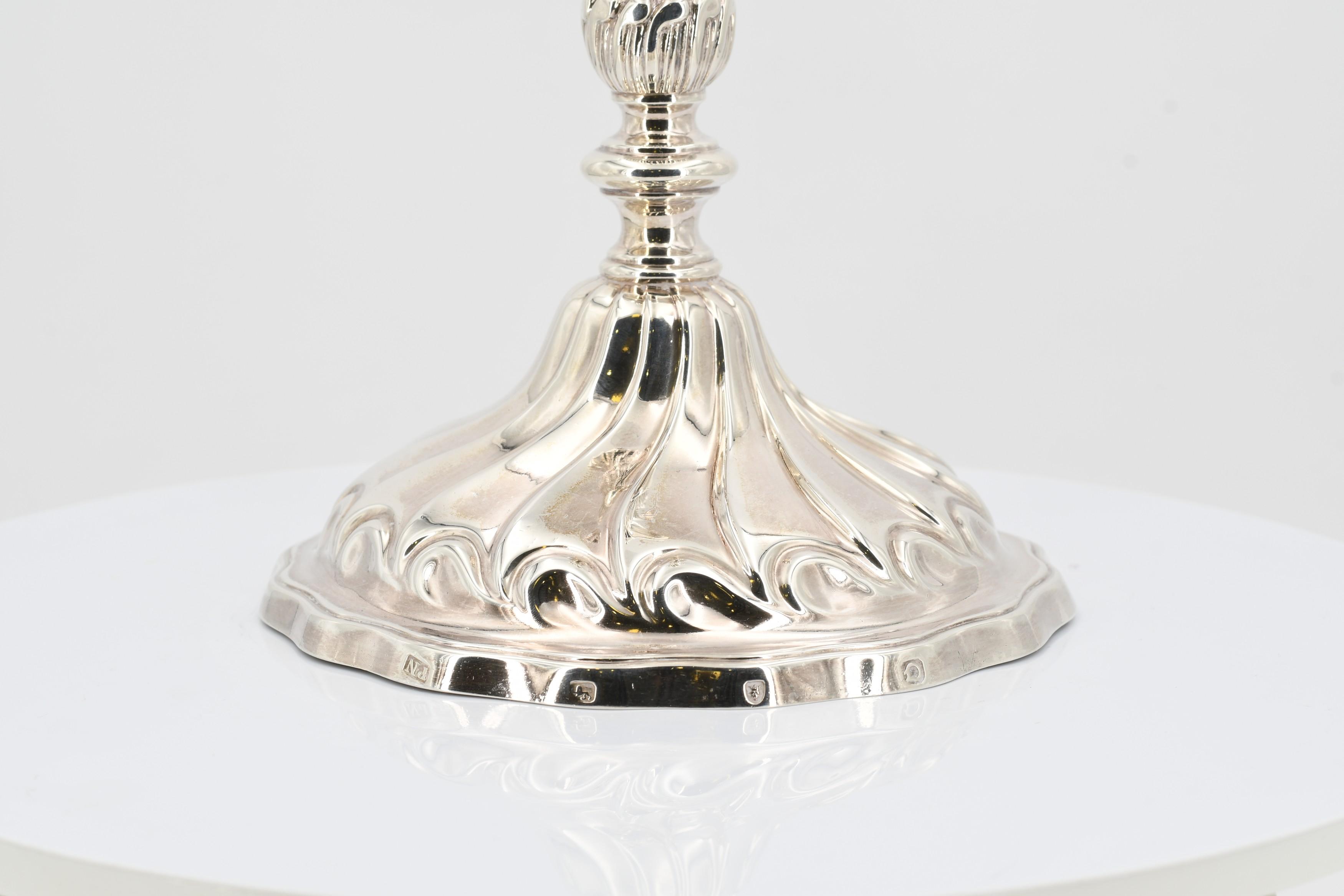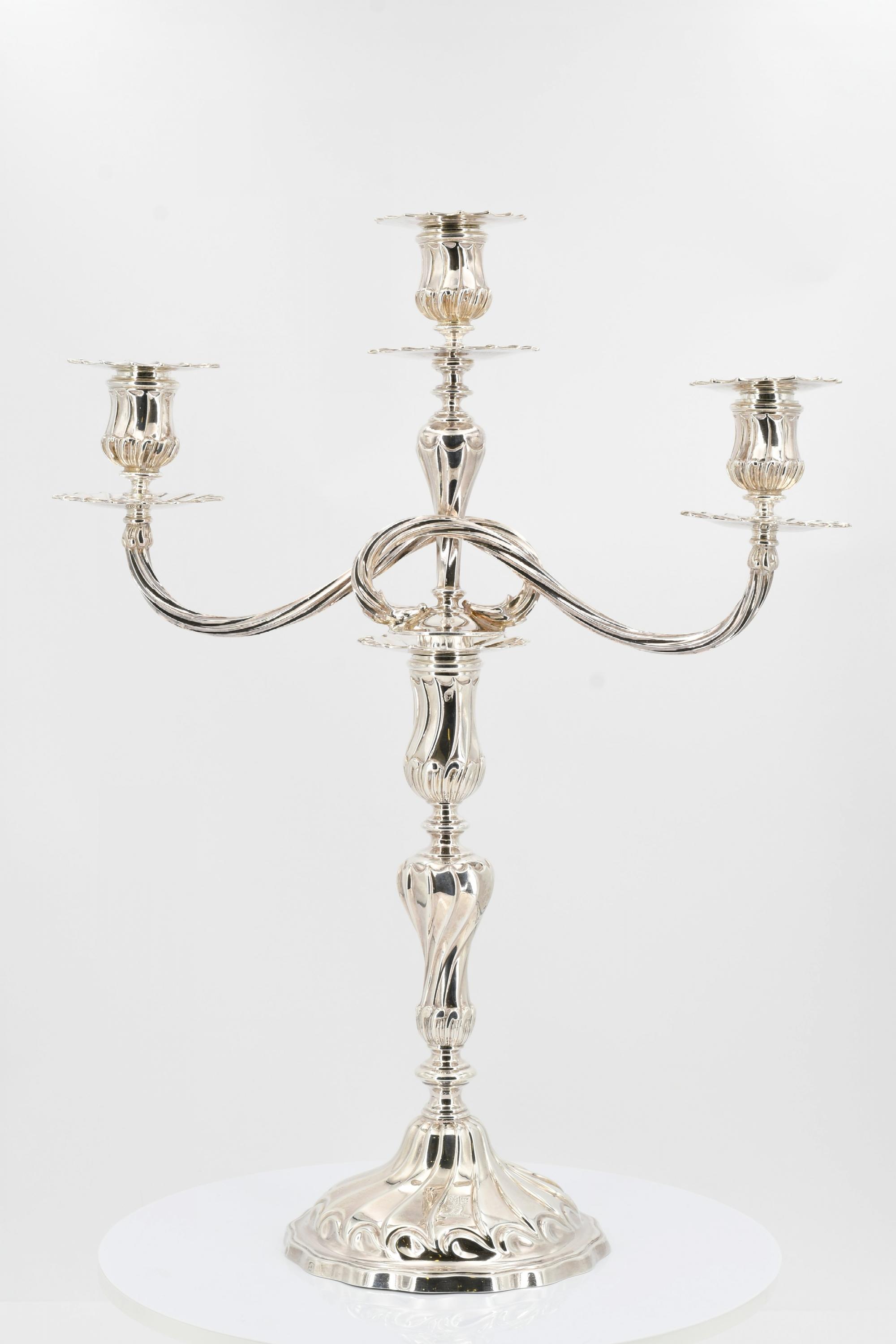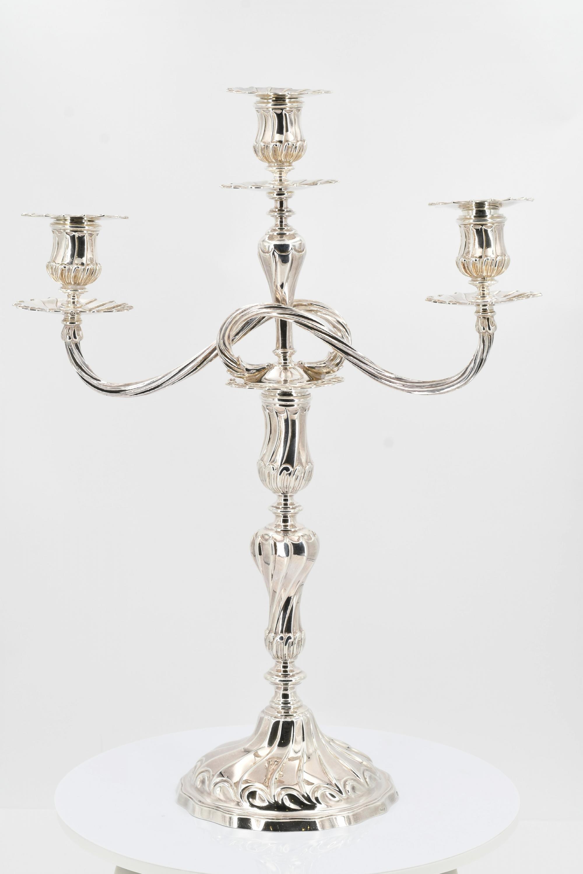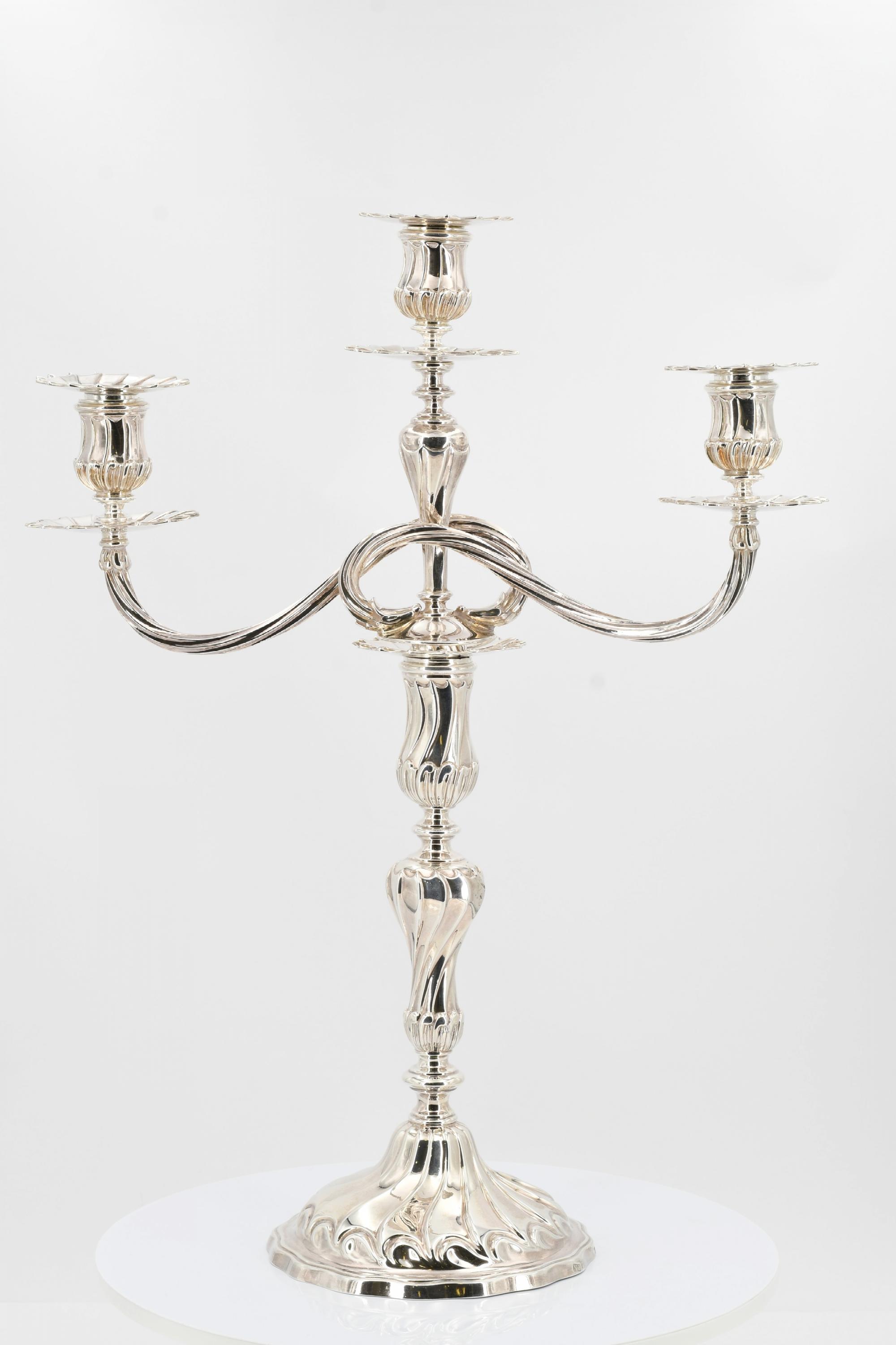 Beschreibung: Je großer Leuchter mit Balusterschaft, darin passender dreiflammiger Leuchteraufsatz. Auf