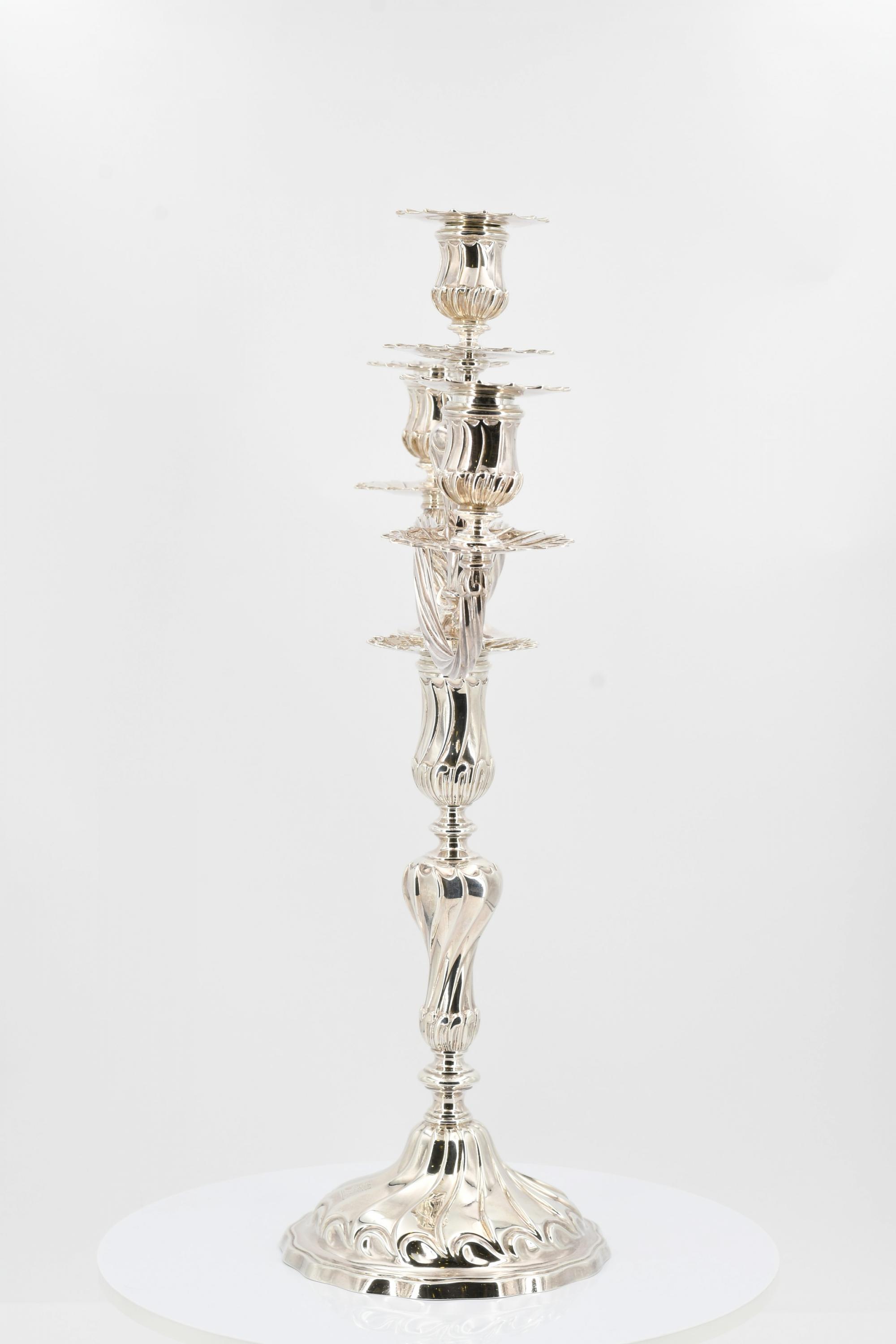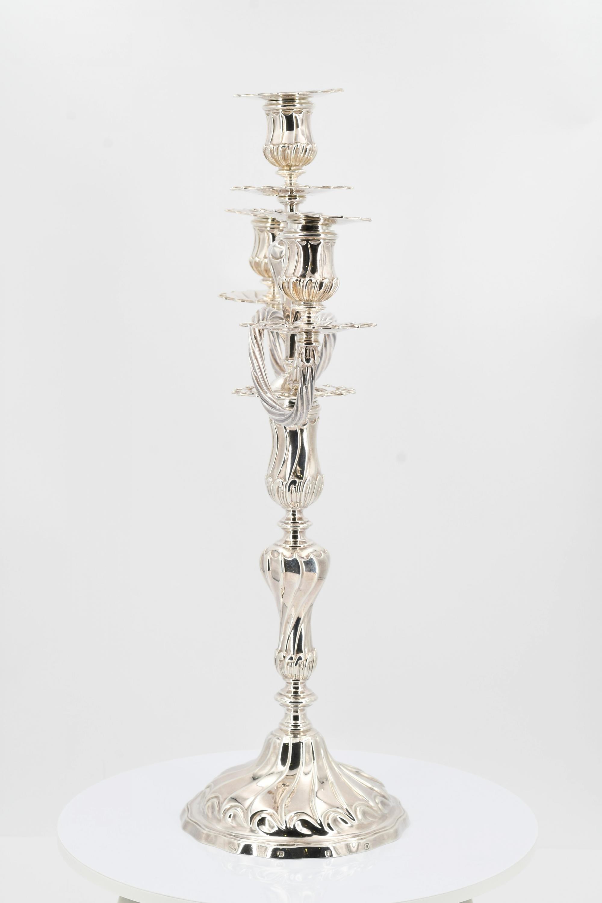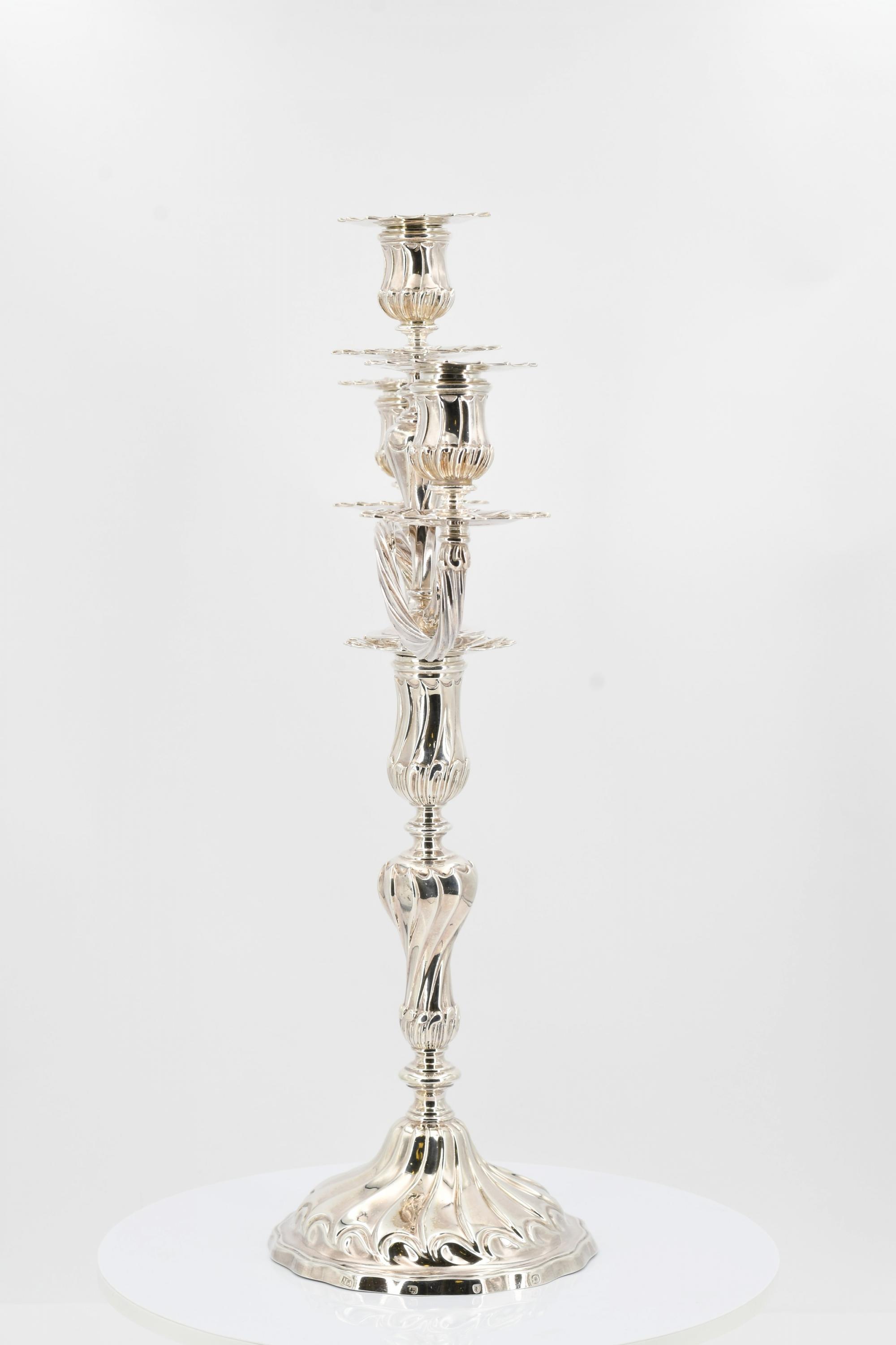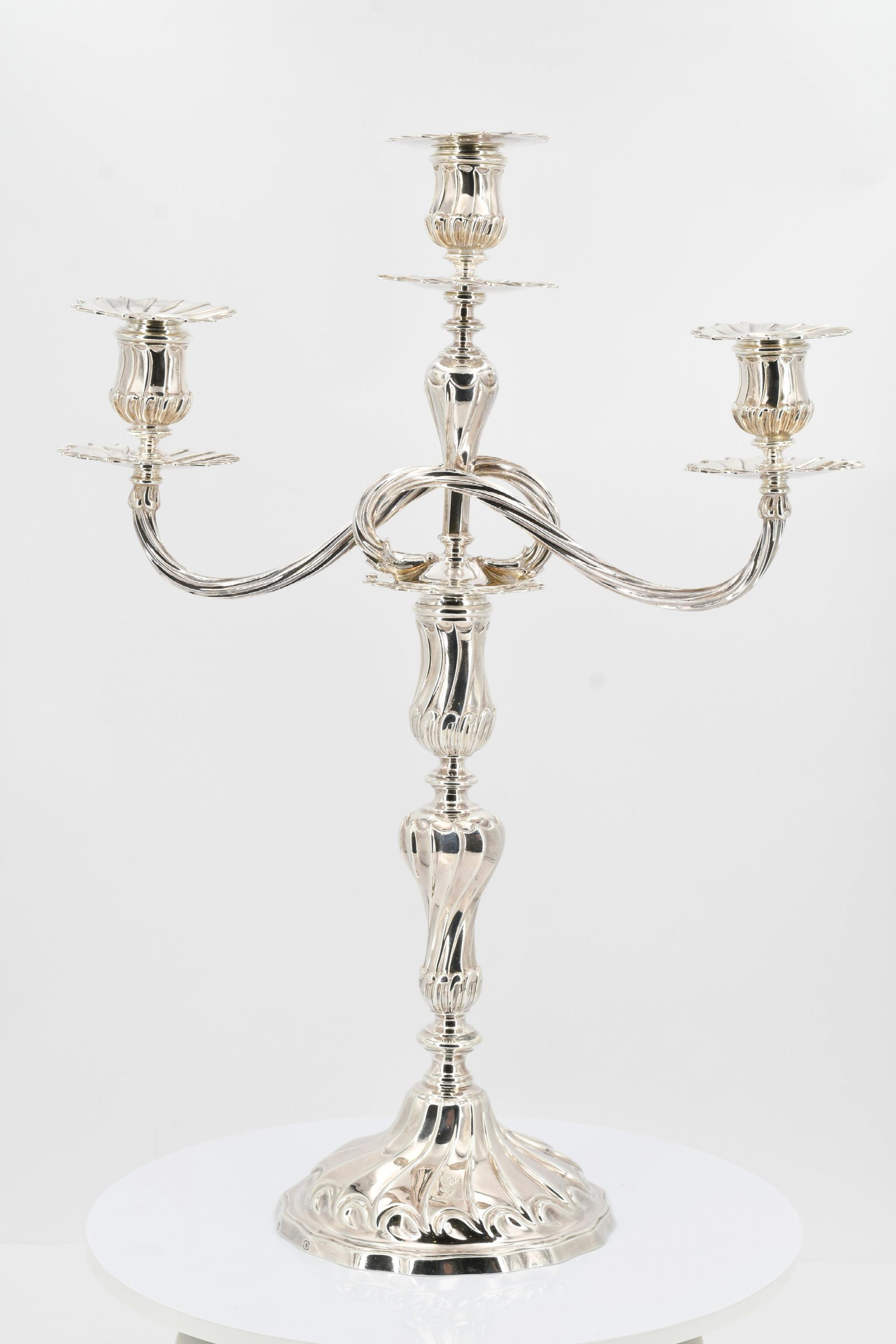 Beschreibung: Je großer Leuchter mit Balusterschaft, darin passender dreiflammiger Leuchteraufsatz. Auf