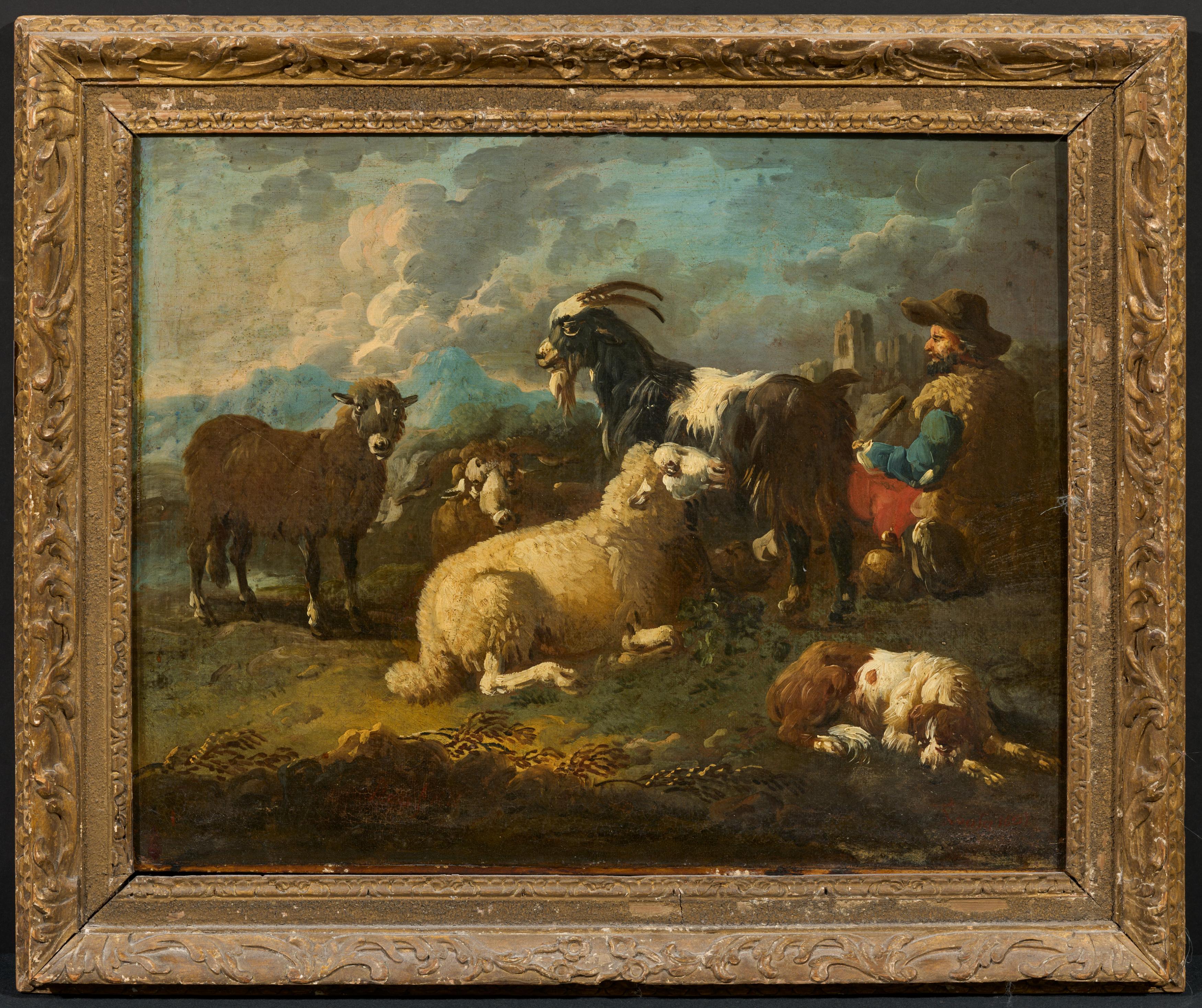 Titel: Hirte mit Ziege und Schafen.